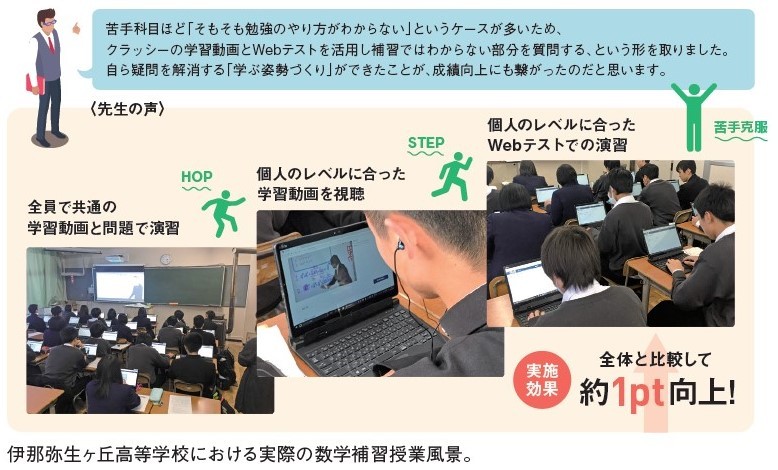 伊那弥生ヶ丘高等学校では、数学の補習授業でクラッシーを導入。一斉学習としてまず全員で同じ学習動画を視聴し、その後、個別学習として自分のレベルに合った動画視聴と問題演習を行った。その結果、補習に参加した生徒の模試の成績を分析すると、参加していない生徒に比べ、偏差値が平均して1ポイント上昇したという。