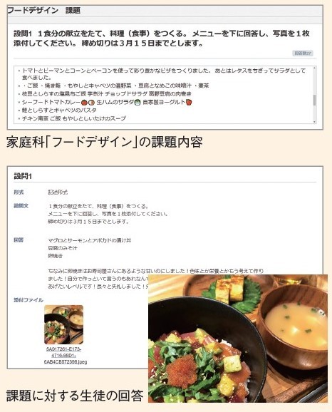 例えば家庭科「フードデザイン」の授業では、下図のような課題が出された。生徒はクラッシーのアンケート機能から設問に回答し、料理の写真を添付して教員に送付する。また、毎朝のSHR(ショートホームルーム)もクラッシー上で実施。生徒は8時45分になったらクラッシー上の「校内グループ」からコメントを送る。コメントがない場合は、教員が直接連絡して状況を確認する流れだ。