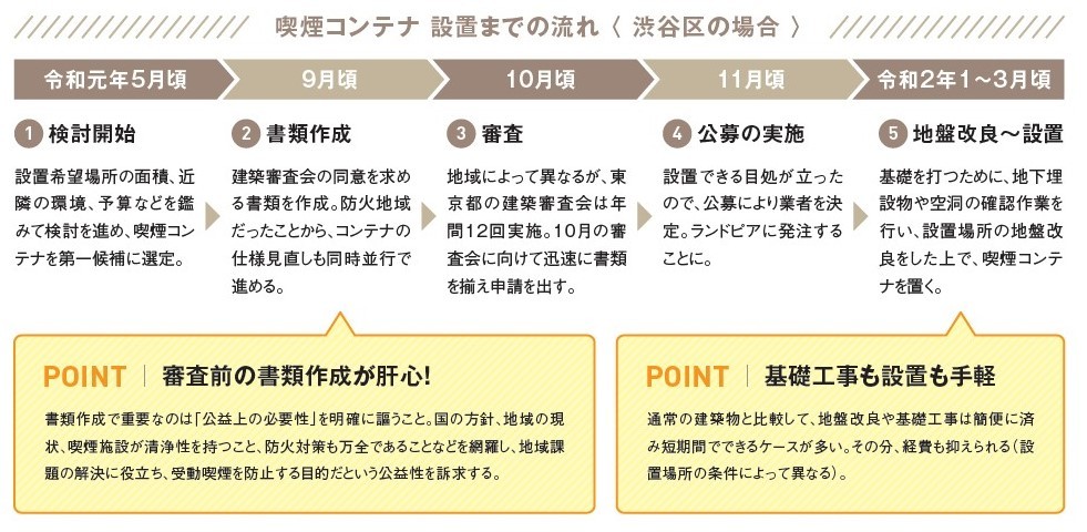 「まずは建築審査会に対し、区内の喫煙状況、国の方針、喫煙コンテナの清浄性などをまとめた書類を提出しました」。設計図書などの作成を含め、関係部署の協力を得ながら書類を提出し、令和元年10月の審査会にかけられた後、晴れて許可がおりた。