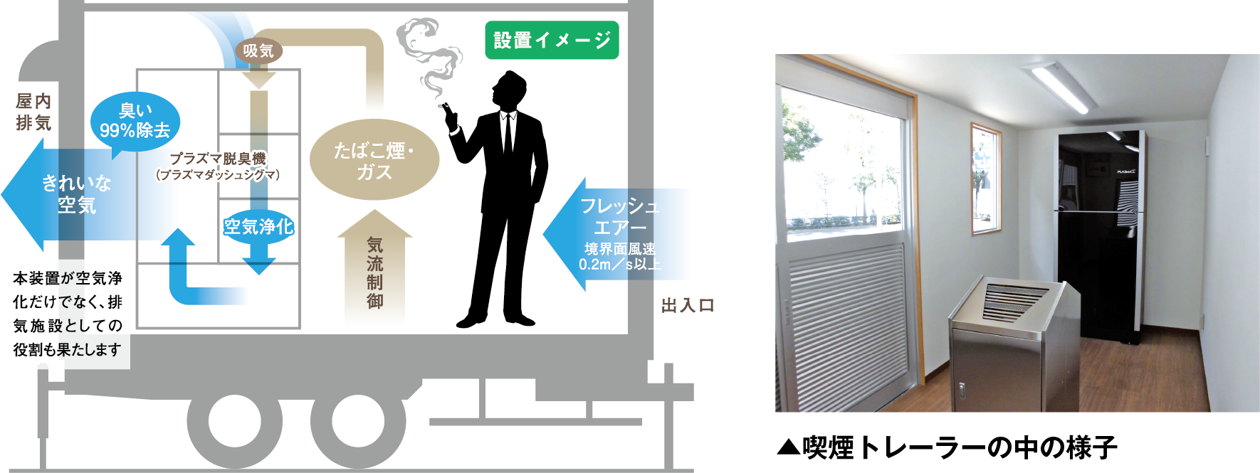 改正健康増進法の基準をクリアした高性能プラズマ脱臭機を装備し、煙・臭いがほとんど外に漏れない。その清浄性ゆえに公園などの近くに設置することもでき、喫煙者も過度な気遣いをせずに済む。