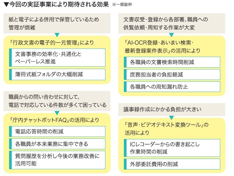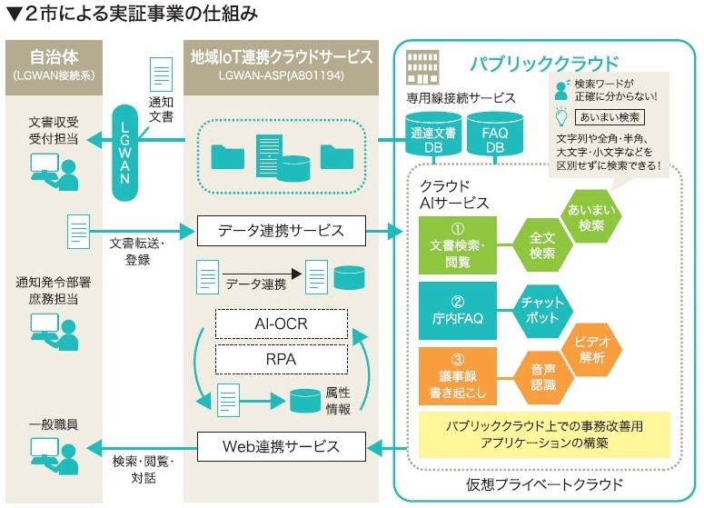 2市による実証事業は、AIを用いた①文書閲覧システム②庁内FAQシステム③議事録作成支援ツールが3本柱だ。①では、通達文書や事務連絡文書を電子化してクラウド上で一元管理。文書の内容(属性)ごとに自動認識・自動登録が行われ、あいまい検索によって必要な書類を検索・閲覧しやすくした。加えて、ペーパーレス化による経費節減も可能だ。②ではチャットボットを活用。「パスワードを忘れた!どうすればいい?」といった職員からの事務処理に関する質問の回答をAIが探し、自動応答を行う。