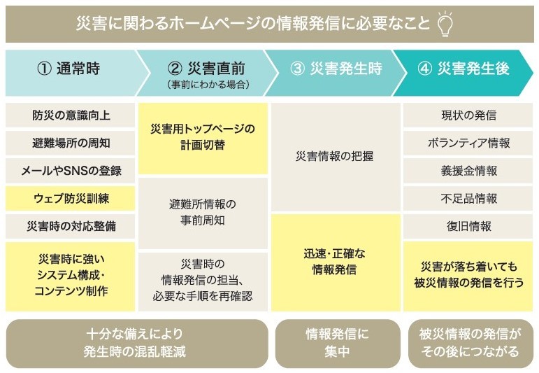 災害に関わる自治体ホームページの役割は、発生時の情報発信だけではない。通常時から災害に関するコンテンツを提供し、住民の防災意識を高める一方で、自治体側も発生時を想定した“ウェブ(ホームページ上の)防災訓練”を行っておく必要がある。「災害発生現場では判断が遅れたり、不慣れな作業に手間取ったりすることも少なくありません。台風のように到来日時が予想できる場合は、数日前から災害ページへの切り替えを計画し、訓練しておくことをおすすめしています。また、通常時には住民に対して、防災メールやアプリへの登録を促しておくことも重要です」。