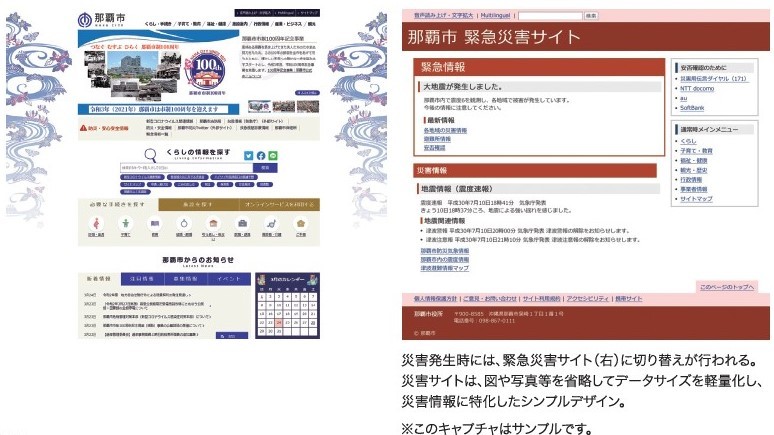 ここ5年間で、計40回もの台風に見舞われた沖縄県(※気象庁発表による接近数)。県庁所在地である那覇市は、令和元年3月にホームページを全面リニューアルし、大規模災害発生時の専用トップページを新規制作した。どの部署の職員でも切り替え可能な仕様としたほか、全国瞬時警報システム(Jアラート)とも連携。アクセス集中時でも住民がスムーズにアクセスできるよう、図や写真等を省略してデータサイズを軽量化している。通常ページにおけるウェブアクセシビリティJIS(JISX8341-3:2016※3)のレベルAA(一部レベルAAAの達成基準を含む)に準拠し、音声読み上げ機能や外国語翻訳機能も導入。