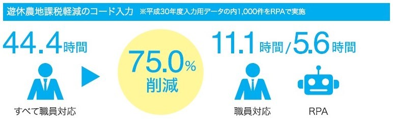 RPAサービスでは令和2年3月現在、税制関連業務や子育て支援業務などの7業務を対象とした、ADWORLD専用テンプレートを提供中。同社と共同でRPA適用の実証実験を開始したある自治体では、固定資産税の遊休農地課税軽減入力作業で75%の時間削減が実現した。同作業を行うのに44.4時間を要していたのに対し、RPA適用後は11.1時間(ロボットによる自動入力時間は含まず)で済むようになった。土地改良に伴う入力作業についても同様の効果が出ており、特定の時期にだけ作業が集中する事務処理を効率化し、ピークカットを実現した。