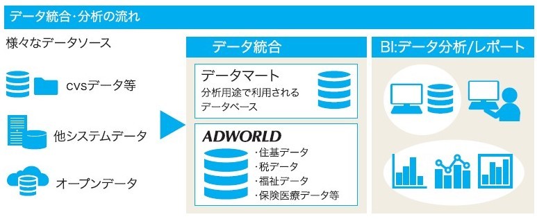 データ統合・分析基盤サービスも、BIツールをADWORLDに組み込むことで、一貫した環境で利用することができる上、住民情報に関連したテンプレートもあらかじめ設定されている。BIツールを新たに購入したりコーディングの手間をかけたりせずに、高度な分析やレポーティングが行える。