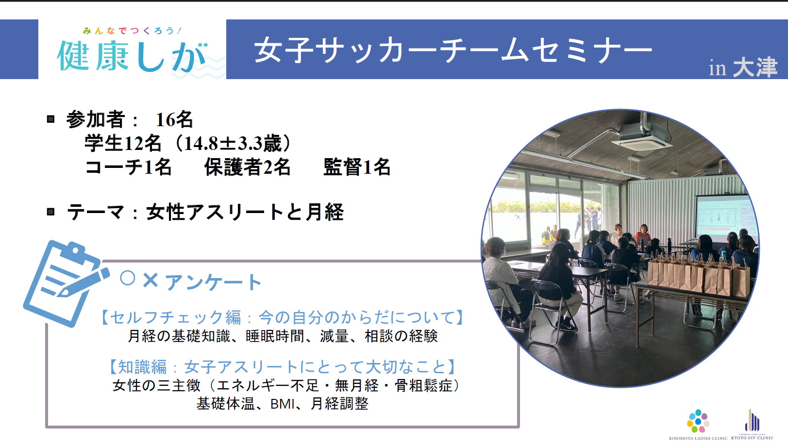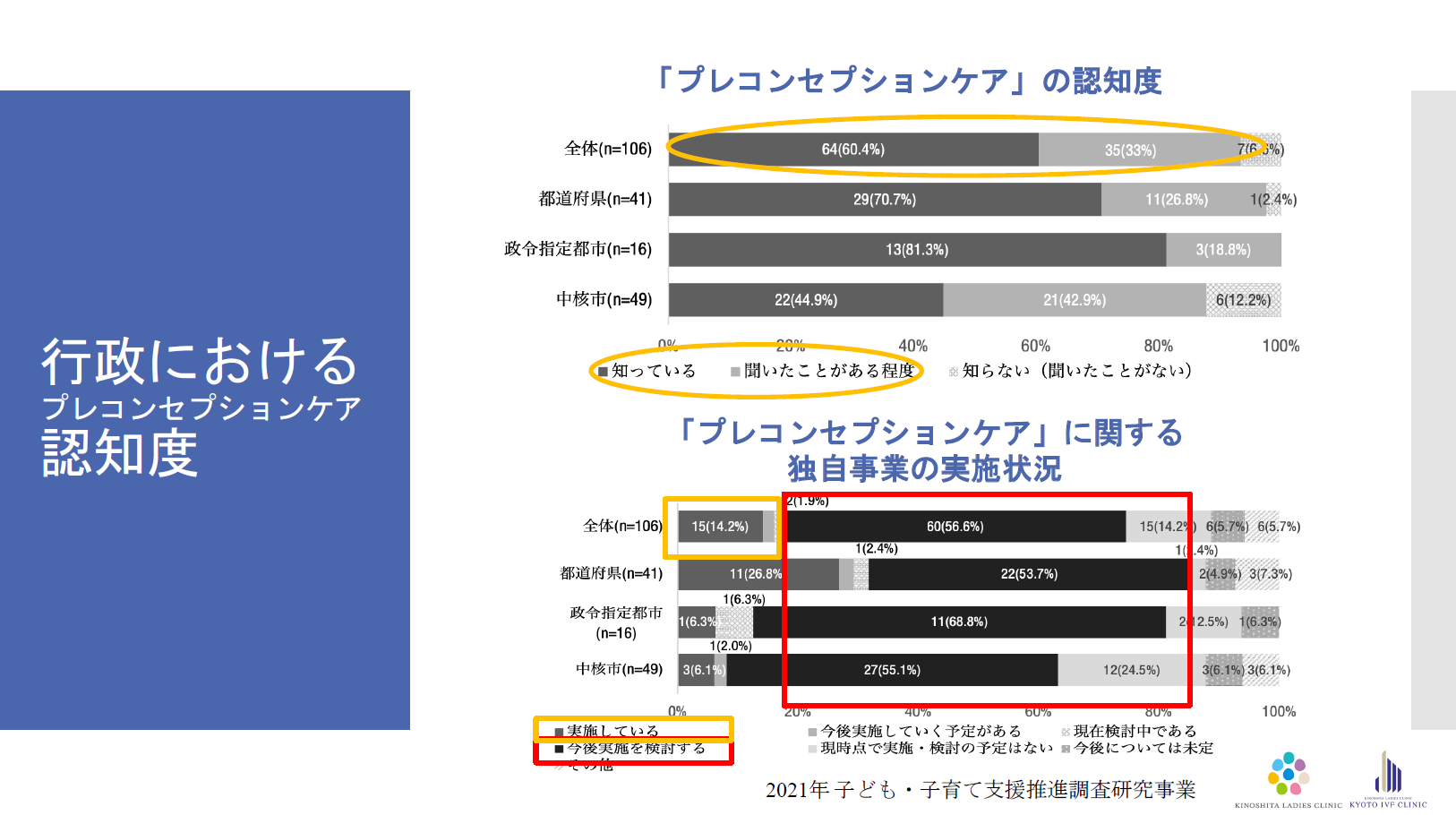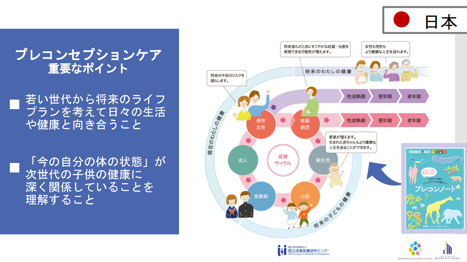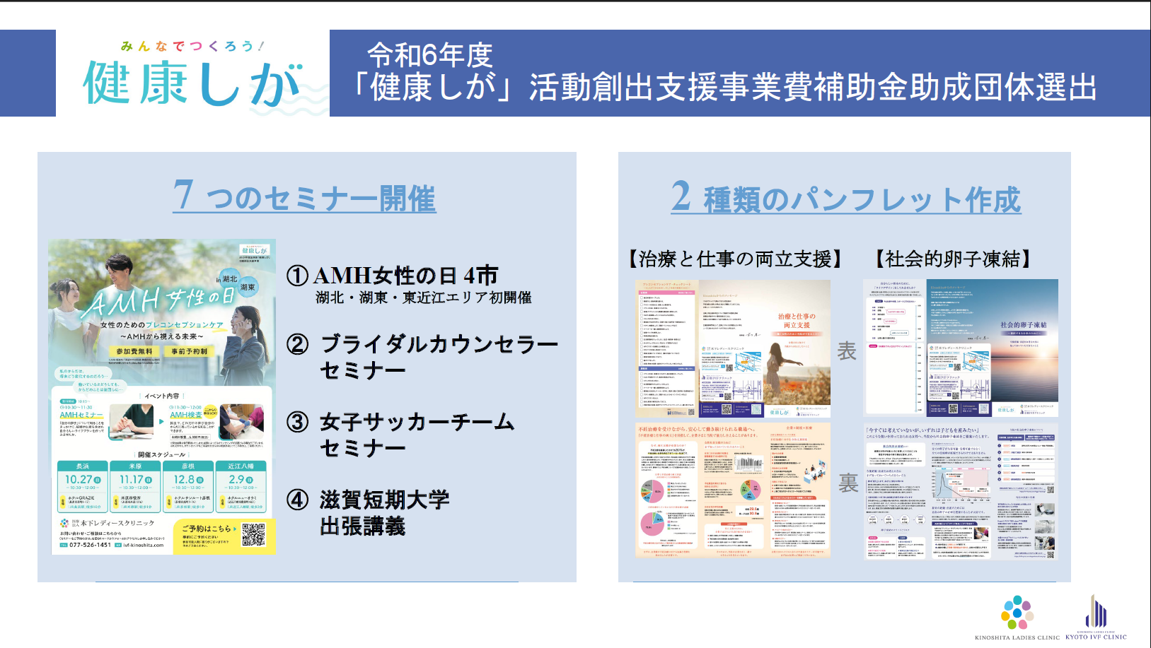 「医療法人木下レディースクリニック」がある滋賀県では、健康医療福祉部子ども・青少年局子育て支援室の母子保健・子育て支援担当の方々と協力しながら、2017年(平成29年)からプレコンセプションケアに関する活動を本格的に始めました。現在は京都府でも活動の幅を広げていく必要があると感じ、府の情報サイトなどに取り組みを掲載することから、少しずつ進めています。