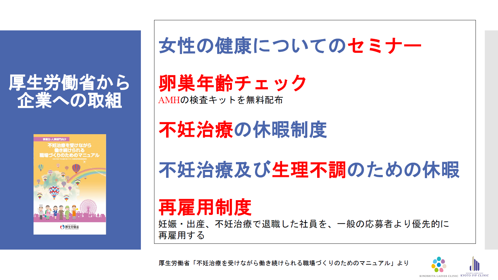 国では「女性活躍推進法」を制定し、各都道府県に対して様々な働きかけを行っています。厚生労働省からも、企業向けに女性の健康に関するセミナー開催やAMH測定の推奨、不妊治療や生理不調に関する休暇制度の導入などについて案内されています。