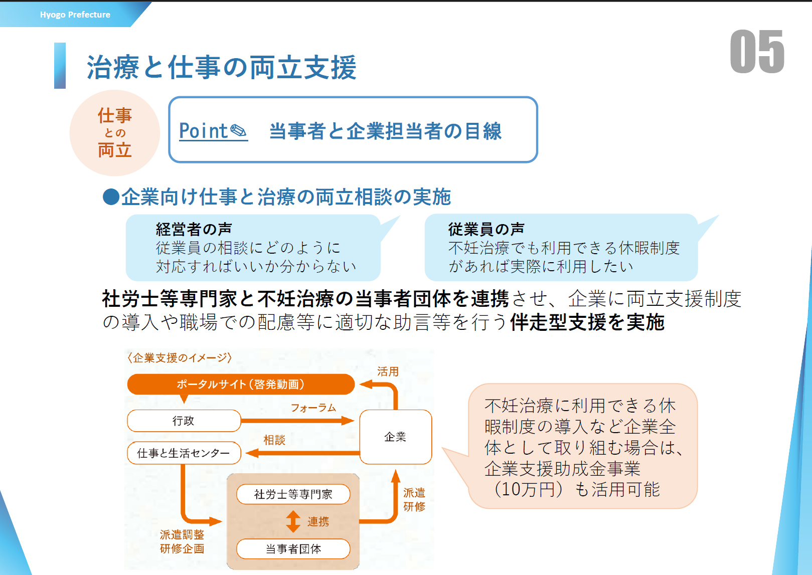 具体的には、社会保険労務士のような専門家や不妊治療当事者の団体と連携し、企業に対して制度導入や職場での配慮について助言する「伴走型支援」を行っています。