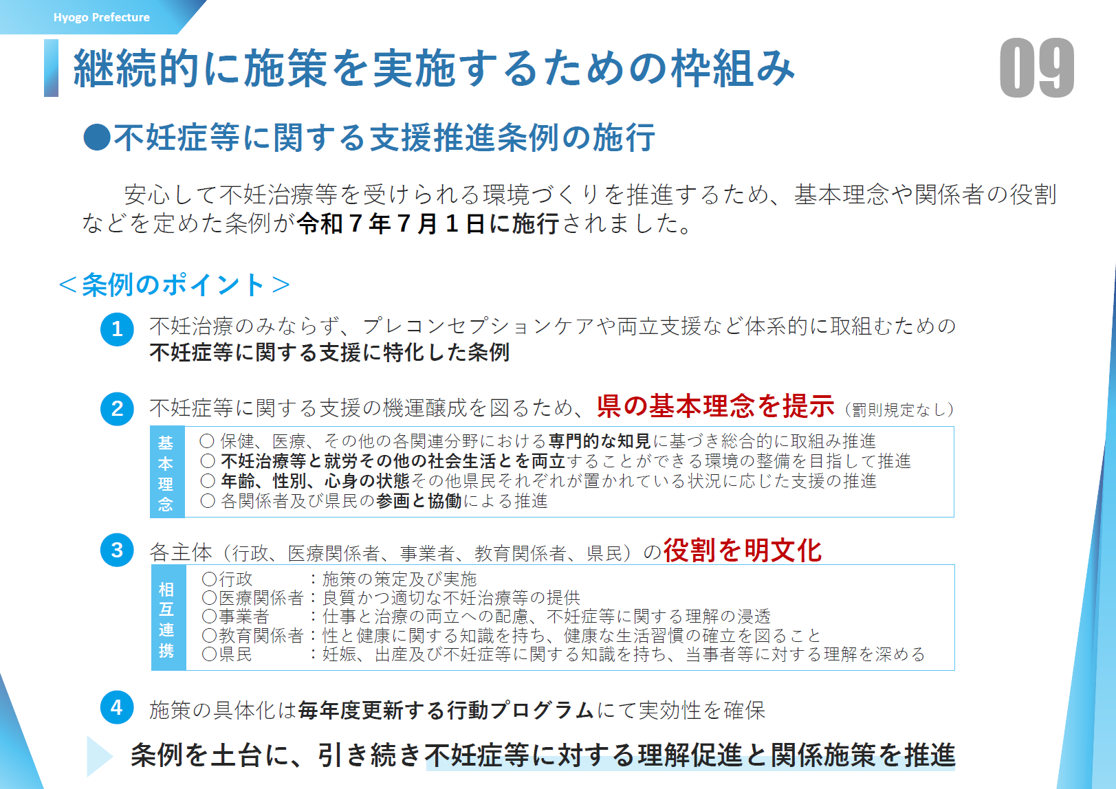 ここまで紹介してきた様々な支援を今後も持続的に進めていくため、兵庫県では「不妊症等に関する支援推進条例」を制定し、2025年(令和7年)7月1日に施行しました。