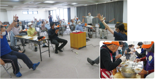 ▲まちの名所や特産を歌詞に取り入れた、“ちょいワル体操”をメンバーと考案。