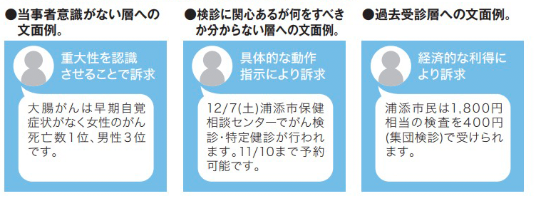 1のデータをもとに、それぞれのセグメント対象者に応じた内容の文章をナッジ理論にもとづき作成。短いメッセージの中で受診のメリット、受診しない場合のリスクの重大性や受診の簡単さなど複数パターンを作成し、市民のアクションにつなげる。