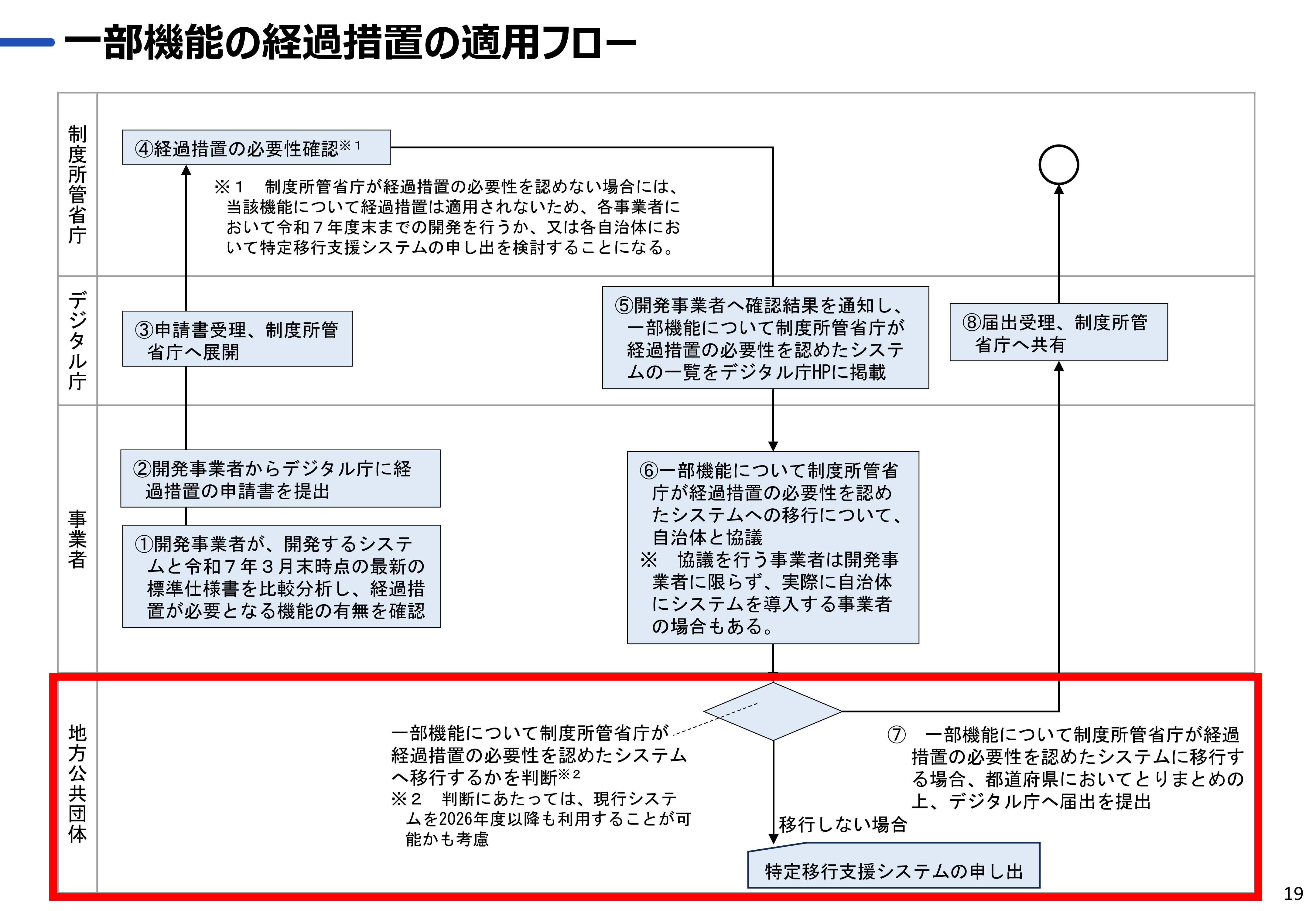 次は基本方針について。昨年12月の改定で1番大きな変更は、「移行困難システム」と呼んでいたものを「特定移行支援システム」とし、対象も改めた点です。多くは事業者のリソースのひっ迫による、ということが分かったので、所要の移行完了期限を設定し、5年以内に標準準拠システムに移行できるよう積極的に支援します。また、移行後の経過措置も新たに設けています。さらに、移行後の安定的な制度運営に向けた標準仕様書改定ルールも基本方針に反映しました。経過措置の適用フローは以下の通りです。