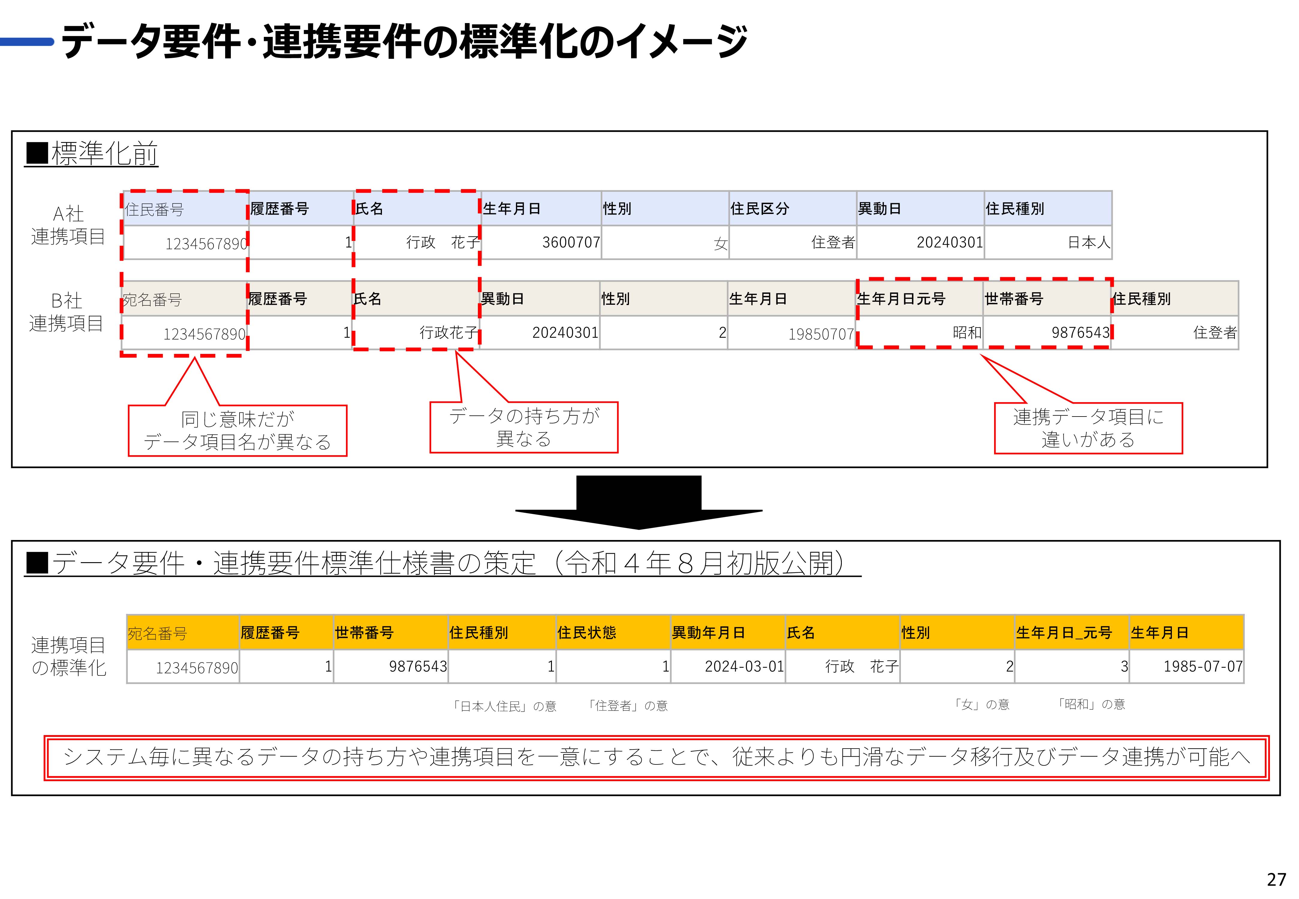 標準化前はシステムによってデータがバラバラでしたが、データ要件によって項目名やデータの持ち方を一意にできます。これによって円滑なデータ移行、データ連携が可能になったといえます。
