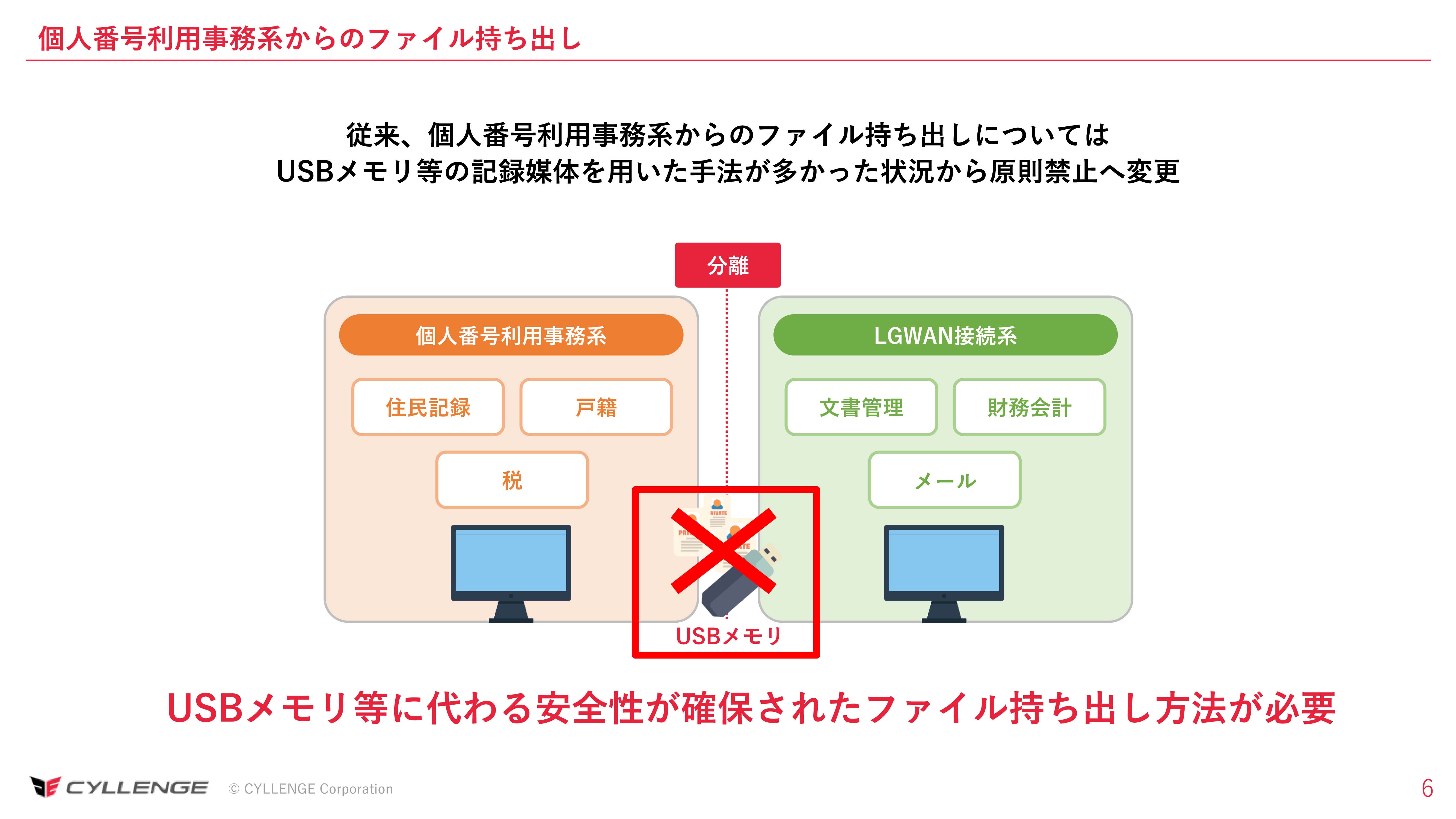 まず、マイナンバー系からのファイルの持ち出しについて。従来はUSBメモリなどの記録媒体を用いた手法が多かったのではと思いますが、これが原則禁止になりました。従って、それに代わる安全性が確保されたファイルの持ち出し手法を考えていく必要があります。この課題に対するソリューションを紹介します。