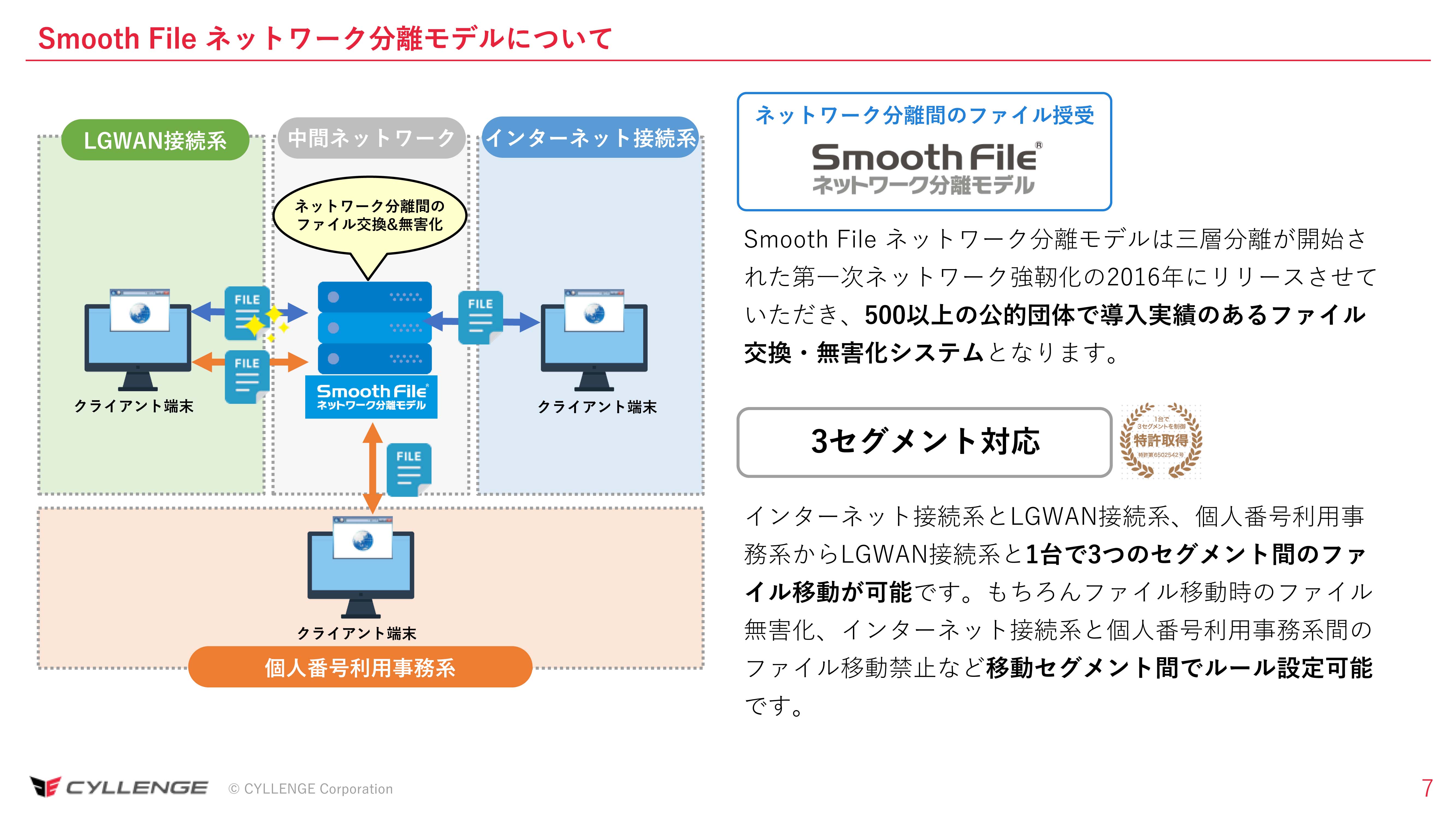 当社の「Smooth Fileネットワーク分離モデル」は、自治体の第1次ネットワーク強靭化の2016年にリリースし、500以上の公的団体で導入いただいている、ファイル交換と無害化ができるシステムです。3セグメント対応という機能があり、三層間でファイルを移動させる場合に利用できる仕様となっています。