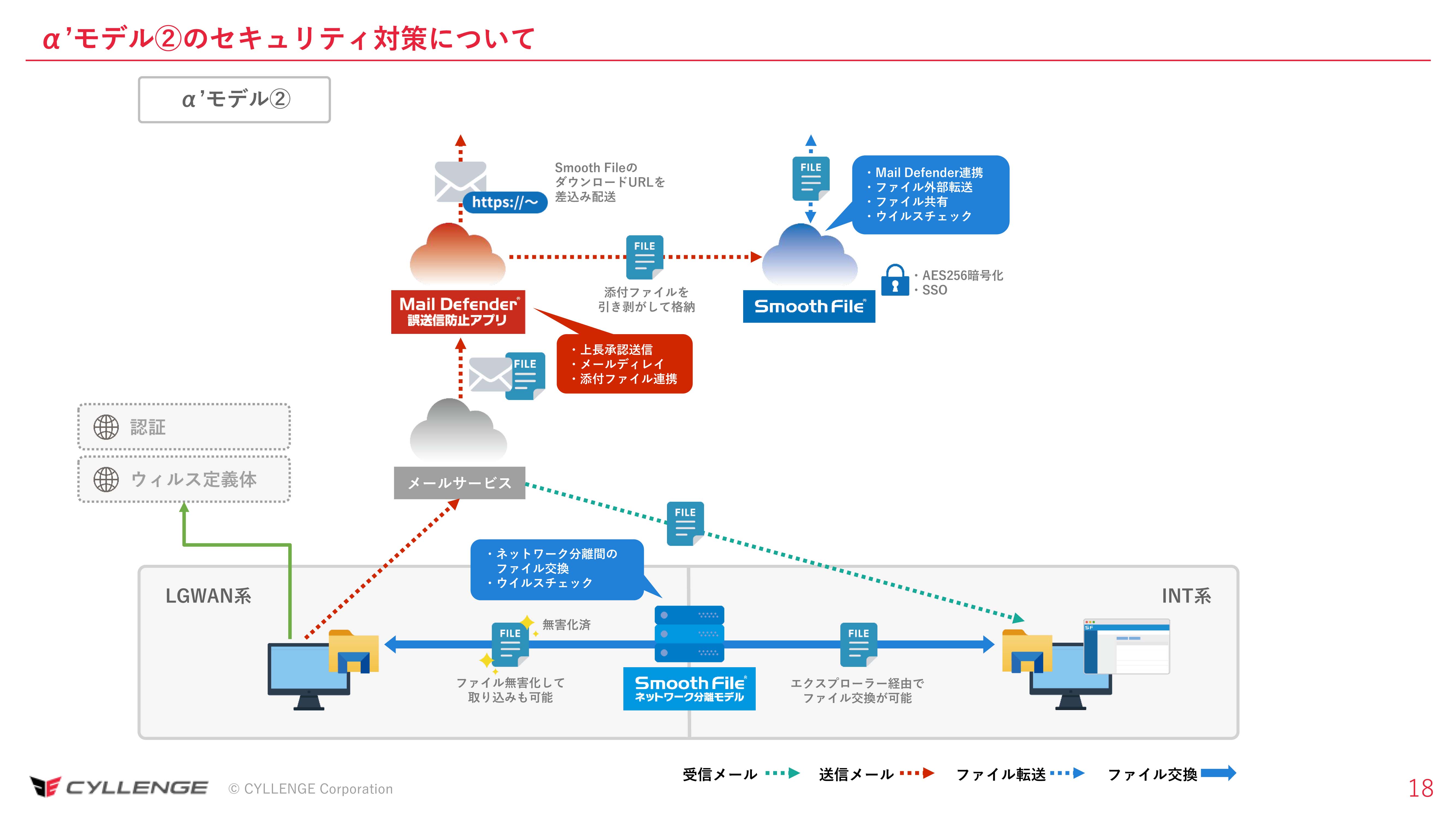 モデルの1のケースでは、現在αモデルを利用している自治体であれば、特に大きな変わりはありません。メールを送る際は、LGWAN側で振り分けのメールサーバーがあれば、そこから「Mail Defender 誤送信防止アプリ」と「Smooth Fileネットワーク分離モデル」を使って添付ファイルを自動的にURL化し、外部から入ってくるメールに関しては、「Mail Defender 侵入防止アプリ」で添付ファイルを無害化。「Mail Defender」で原本を保管して、無害化した添付ファイルはLGWAN側のメールサーバーで見られる形になります。