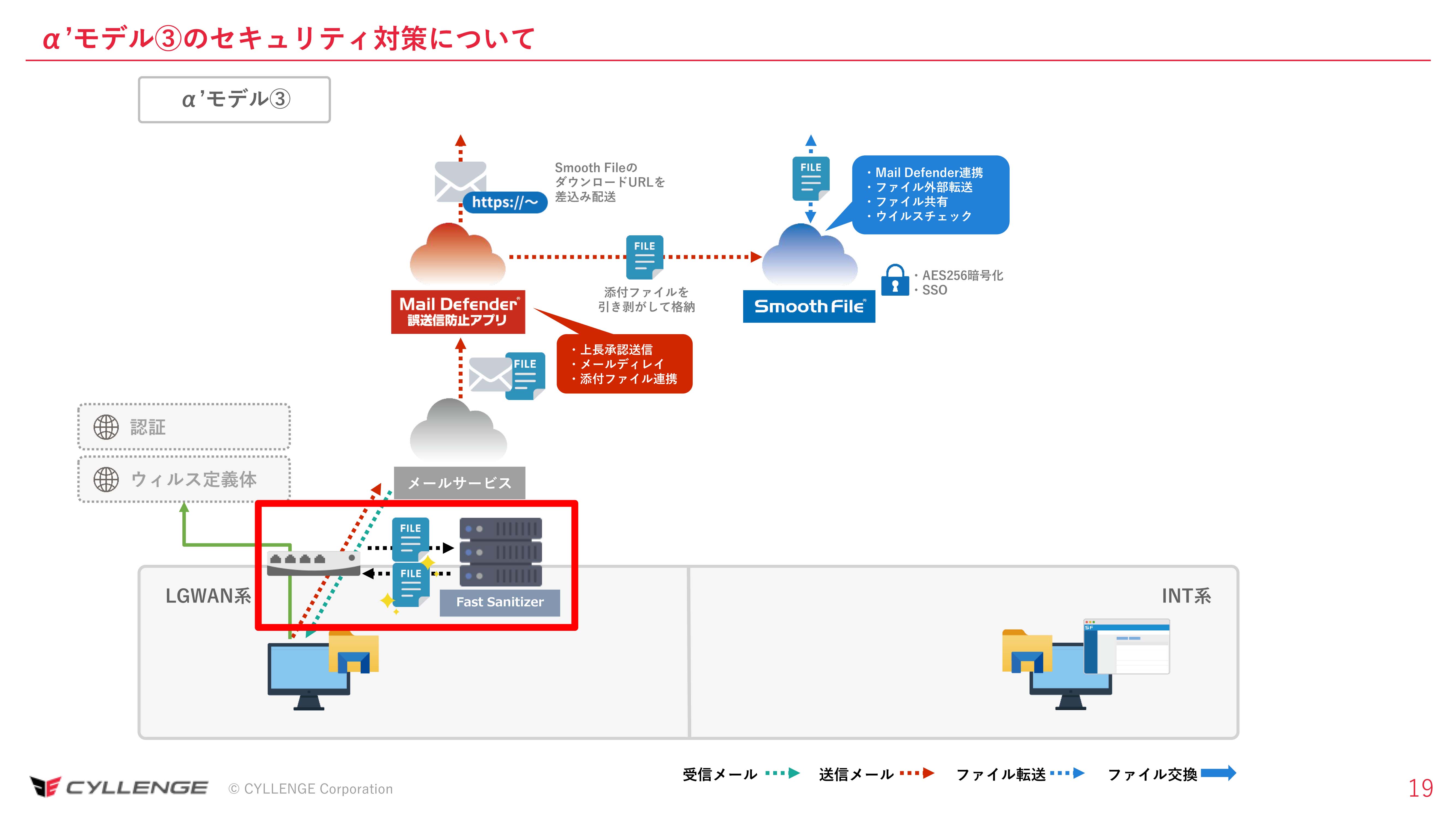 そしてモデル3。メール送信に関しては同じ流れですが、受信メールの添付ファイルをLGWAN側にダウンロードするのが大きな違いで、その際に無害化を行うのが「Fast Sanitizer」というソリューションです。