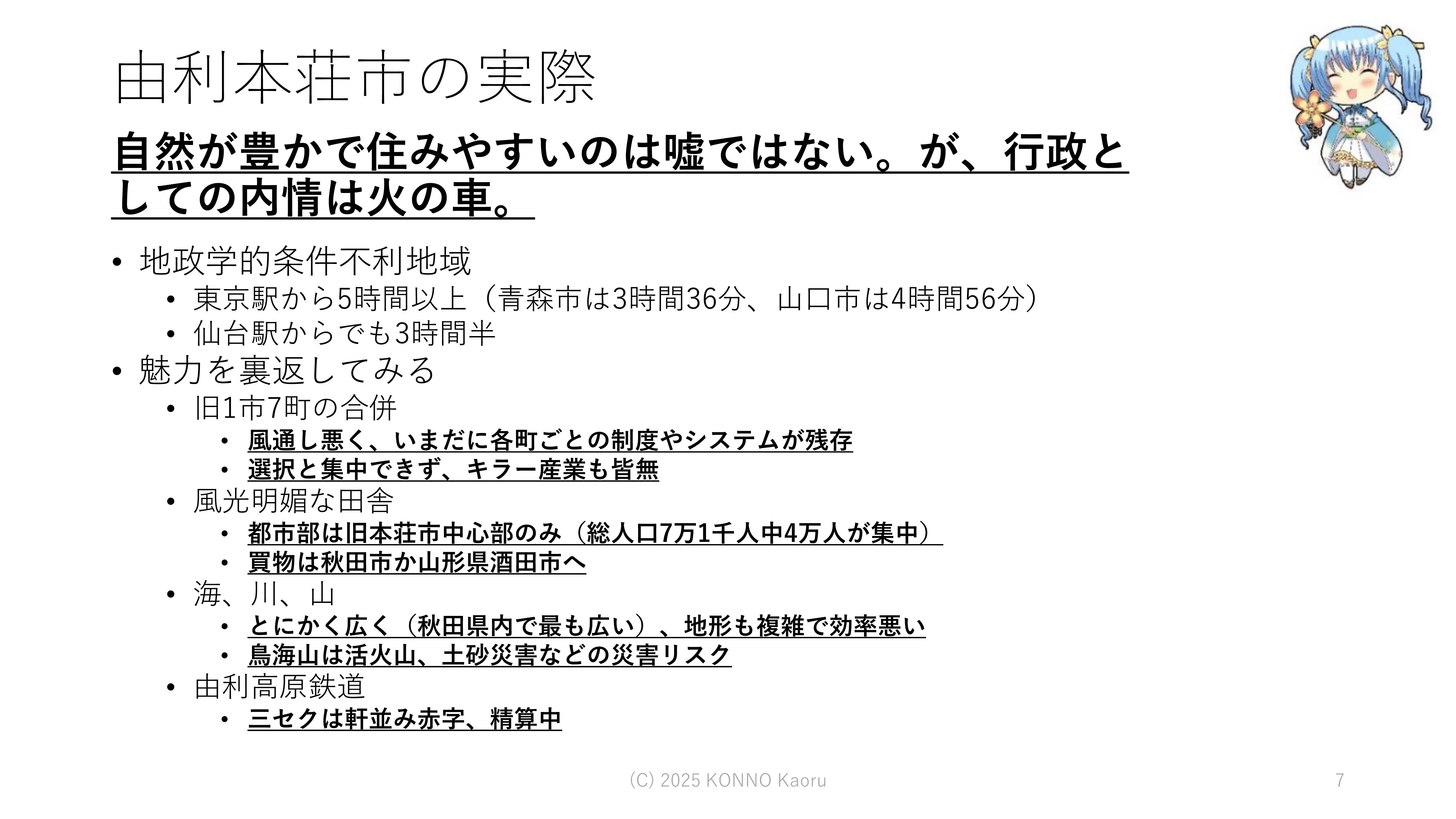 当市は大都市圏からの時間的距離が長く、行政の実態としては火の車です。多様といいつつ選択と集中ができていない。自然が豊かですが、地形が複雑で移動効率が悪く、施設の最適配置にも苦労していて、都市の経済力がない。そうした中で人口が減っていき、職員のリソースもスキルもジリ貧です。