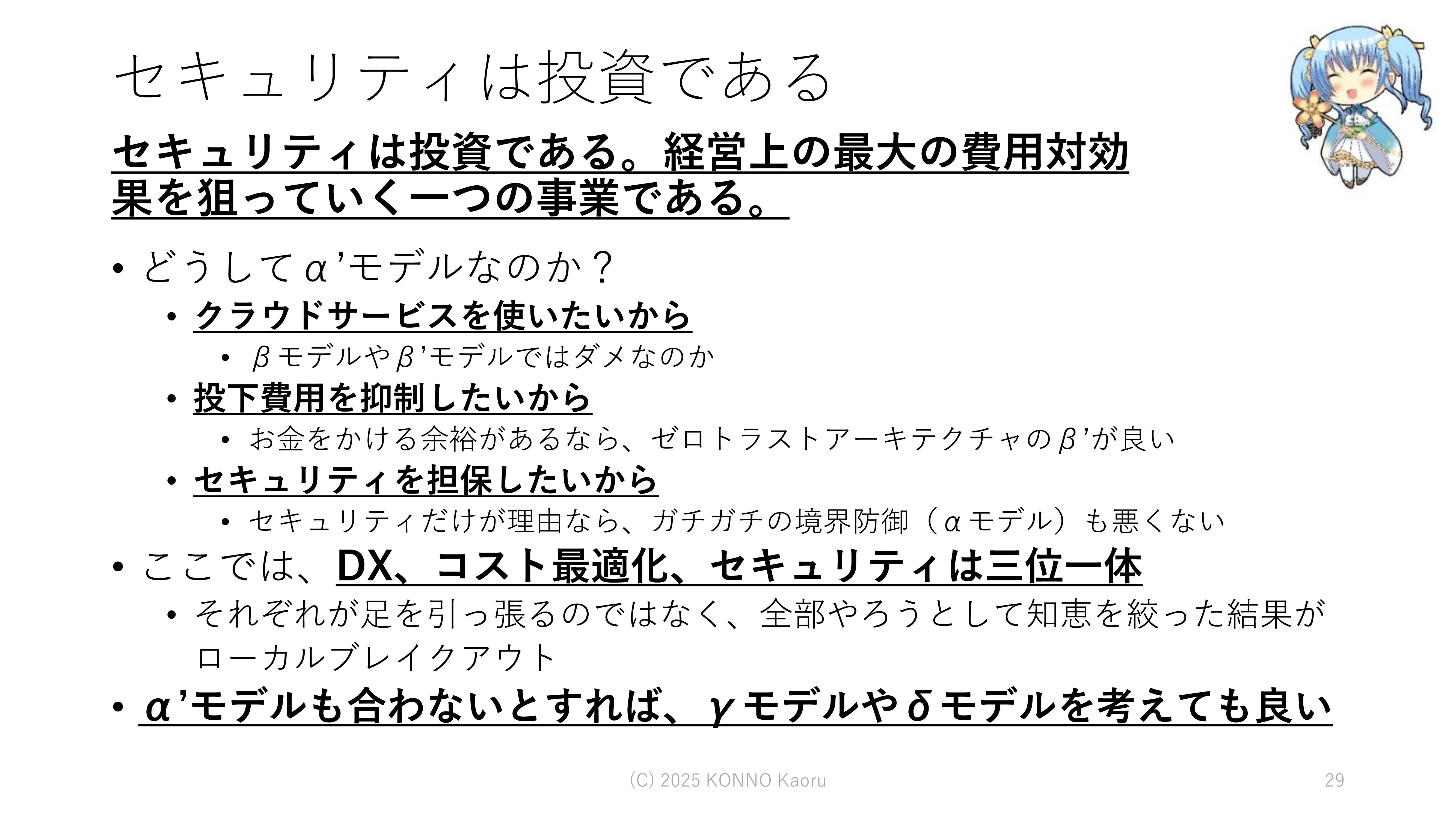 セキュリティというのは経営上の投資であり、ただのコストではない。どうしてα´なのかを考える時は、クラウドサービスを使いたいから、コストを抑制したいから、セキュリティと両立したいから、といった総合的な観点からモデルを構築する。それを全部やろうと知恵を絞った結果がローカルブレイクアウトです。私がこの事業を担当した時、α´モデルという概念は存在せず、ガイドラインにもなかったので考えた訳です。