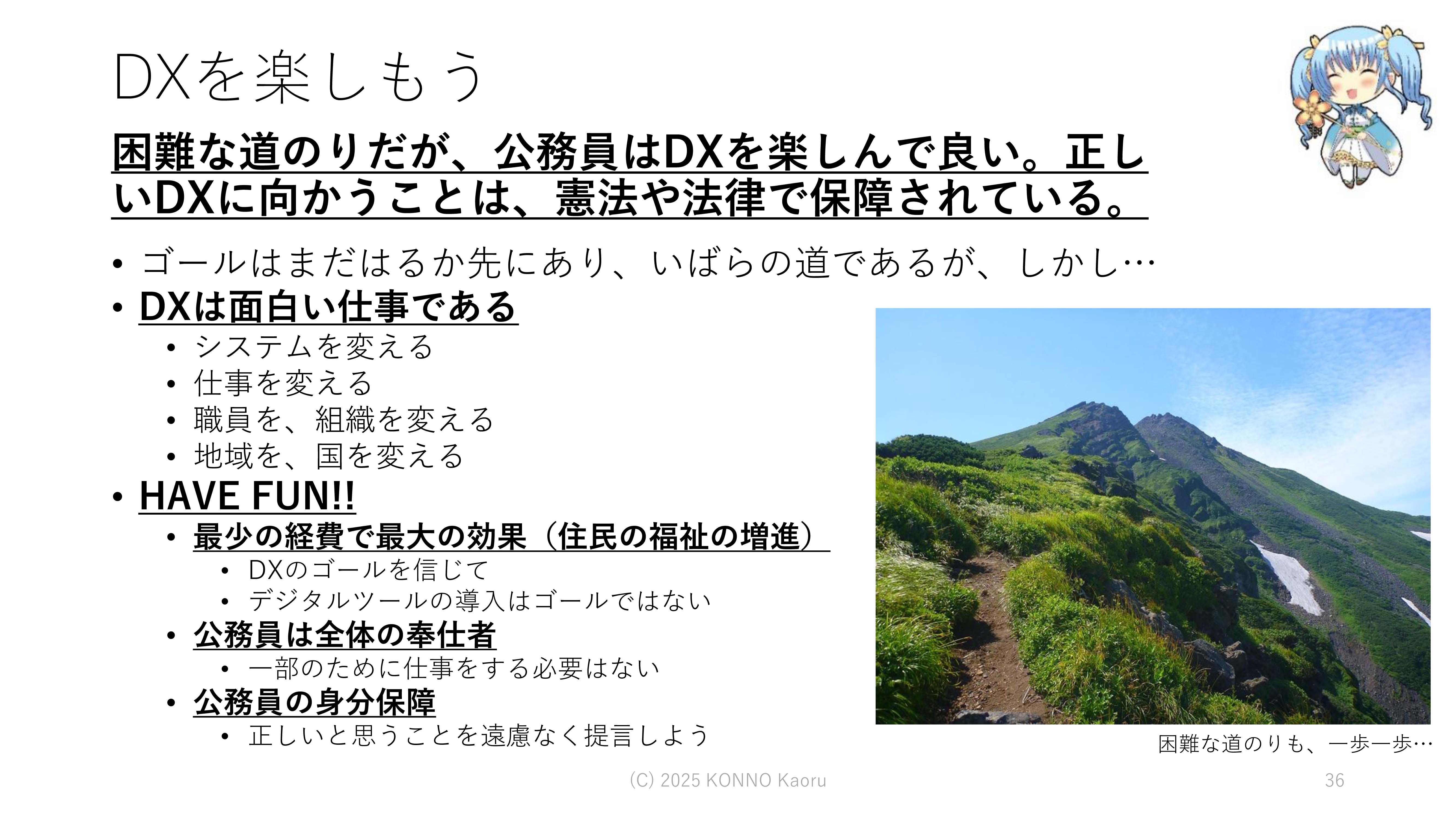このように色々考えるべきこともあって、ゴールはまだまだ先ですが、だからこそDXは面白い。システム変革を通じて仕事を変え、組織を変えて、地域を変えて、国も変えていけるという意味ではとてもクリエイティブな仕事なので、堂々と面白がっていいのではと思います。