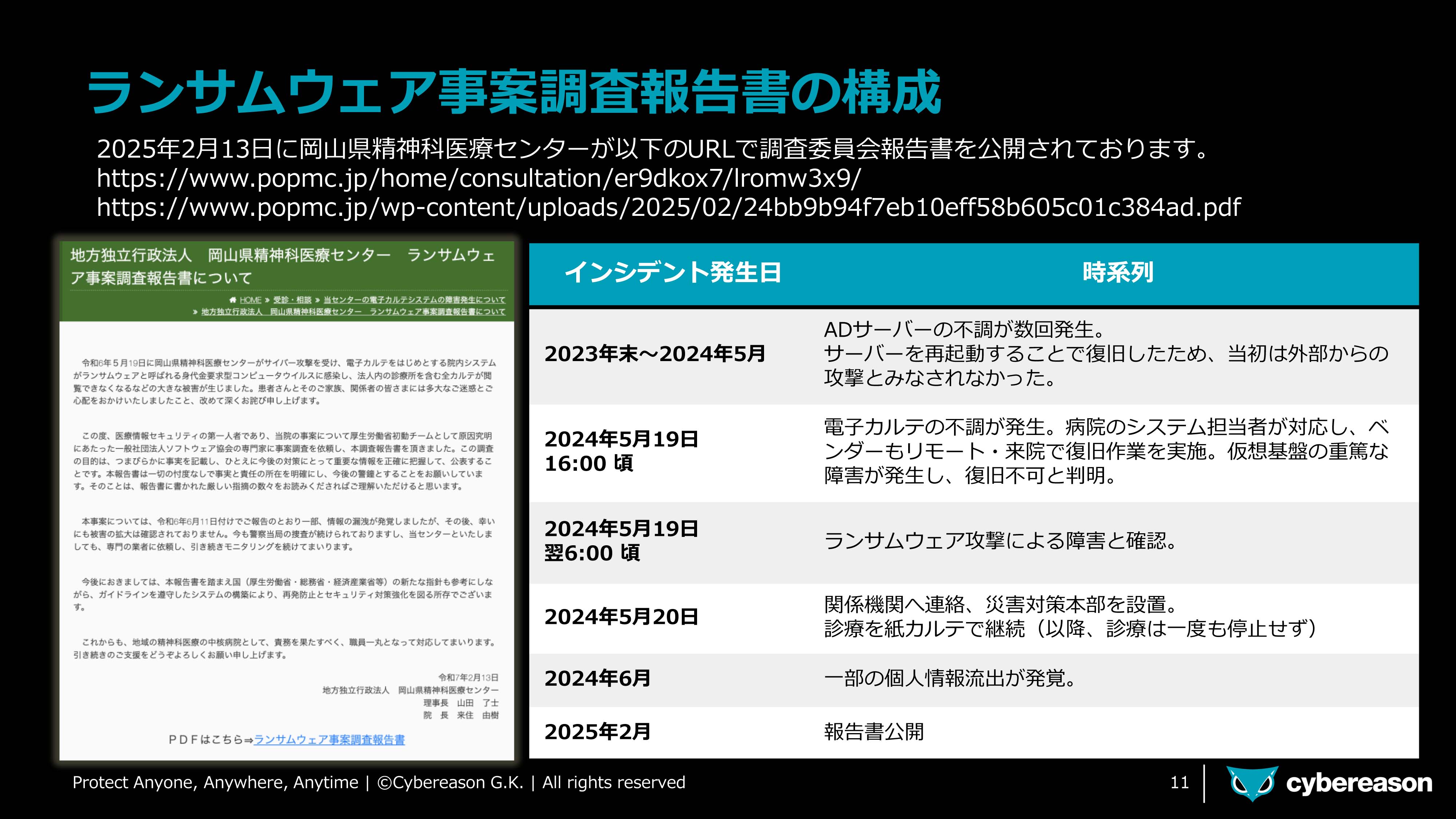 上の表は、事案を時系列表示したものです。攻撃によって電子カルテシステムを含む病院情報システム全体が暗号化されてしまい、3カ月システムが停止するという重大な事案となりました。