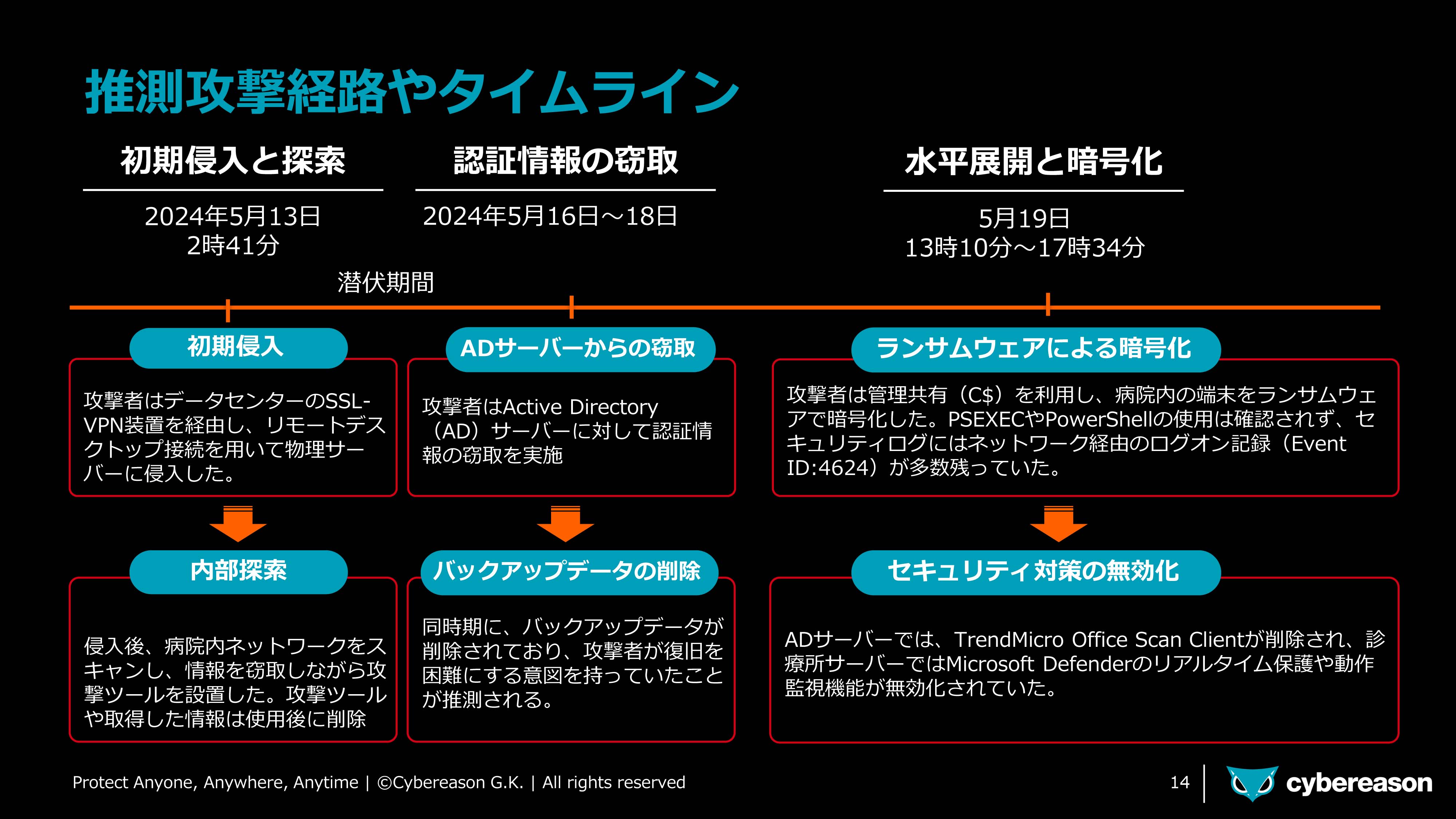 その後、水平展開を行った上で管理共有を使い、病院内の端末をランサムウェアで暗号化。セキュリティソフトも削除あるいは無効化されていました。