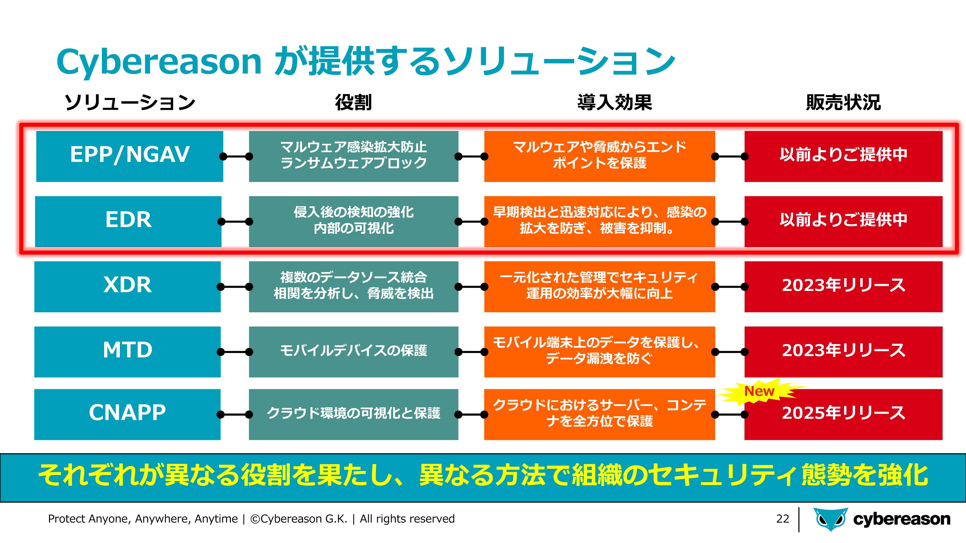 最後に、横展開による被害の拡大。この点もEDRなどを使えばアラートを上げて対応することができます。先に挙げた事例も、当社ソリューションを導入していれば素早く検知して被害が出なかった可能性が高いと考えています。