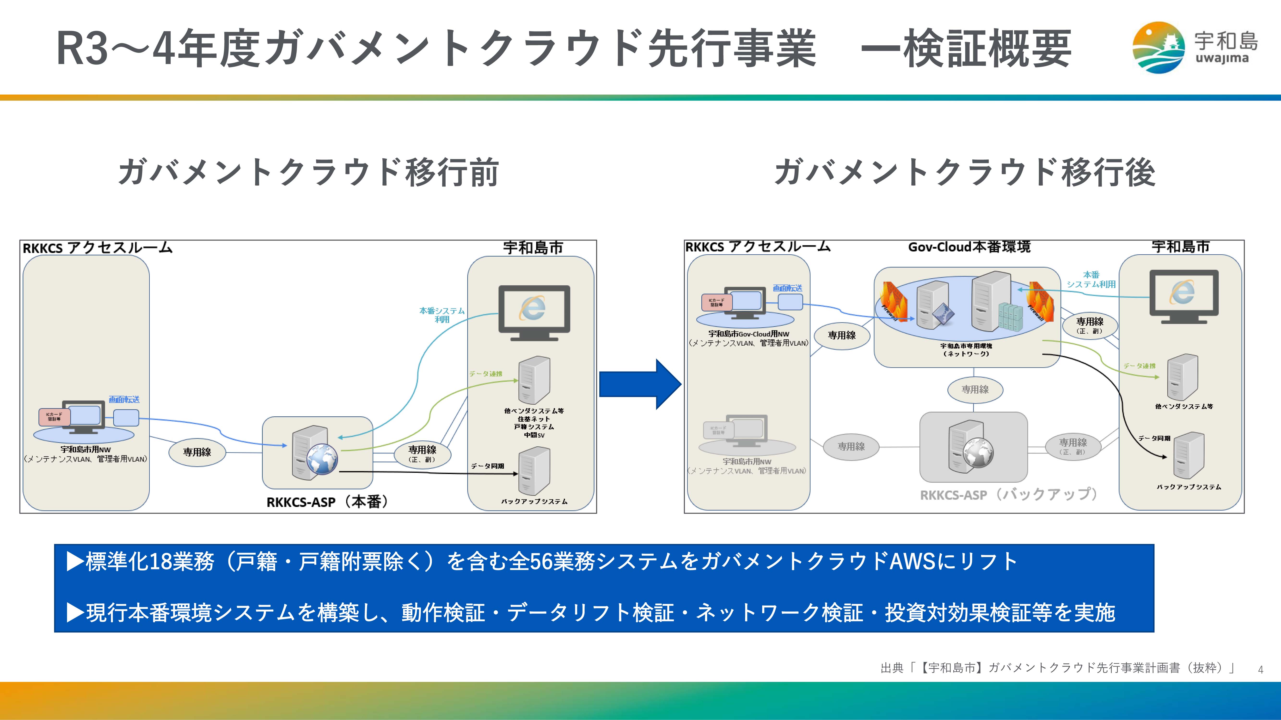 図左側がガバメントクラウド移行前の姿です。単独クラウドとして、RKKCSという事業者のASP環境に、標準化18業務と財務会計や人事給与、契約管理などのシステムを含むオールインワンパッケージとして利用していました。先行事業団体募集の話がデジ庁から出た時、コスト面やガバメントクラウド移行にかかる業務負担を平準化できるというメリットがあったことから同社に打診し、実現に至りました。