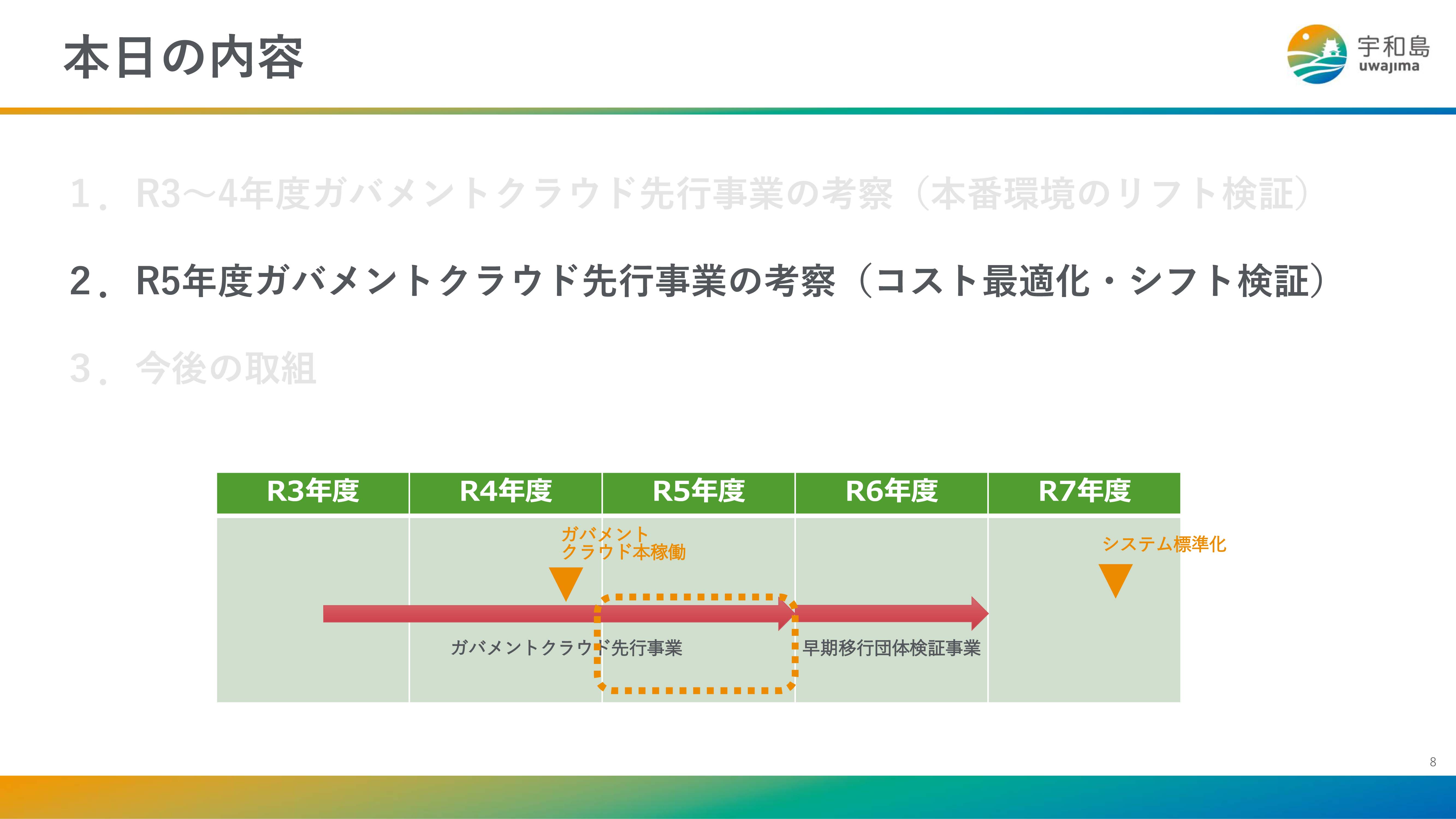 コストについては、クラウド上での物理分離が必要になったためコスト増につながっており、これをいかに抑えるかについては令和5年度の先行事業の検証項目にしました。