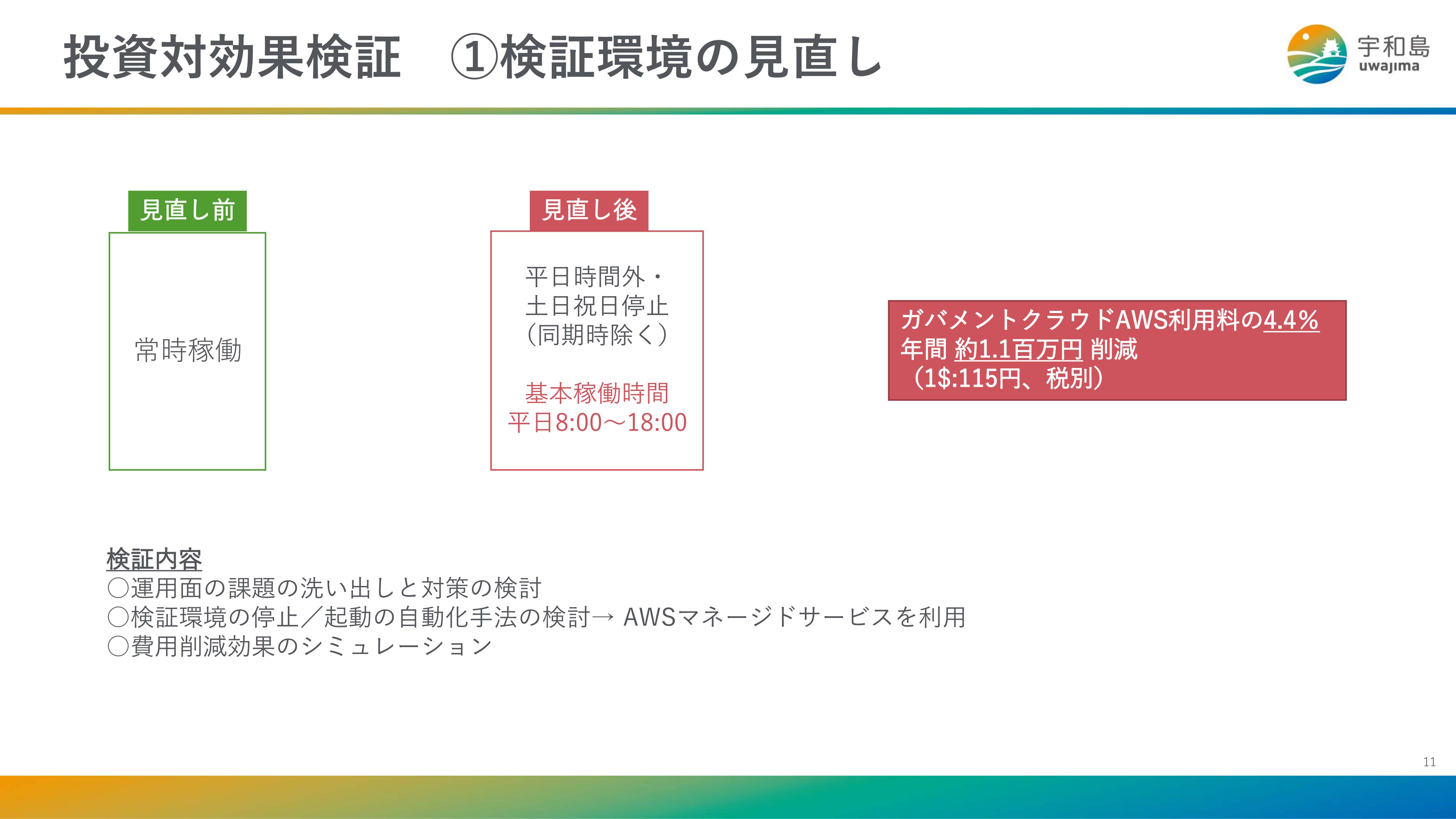 1つ目に、検証環境のシステム稼働時間の見直しを行いました。ガバメントクラウドが従量課金であることを庁内で説明し、勤務時間内に利用することで理解を得ました。見直し後は年間110万円ほど削減できています。