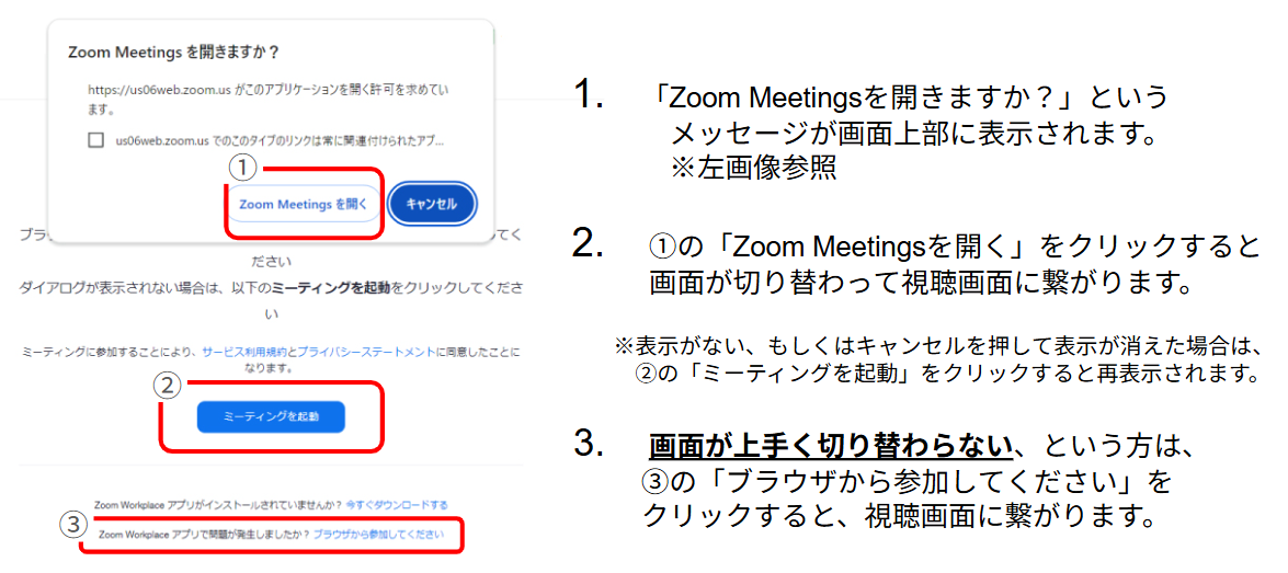 表示される案内に従い「ブラウザから参加」をご利用ください。