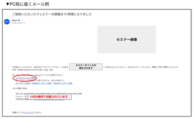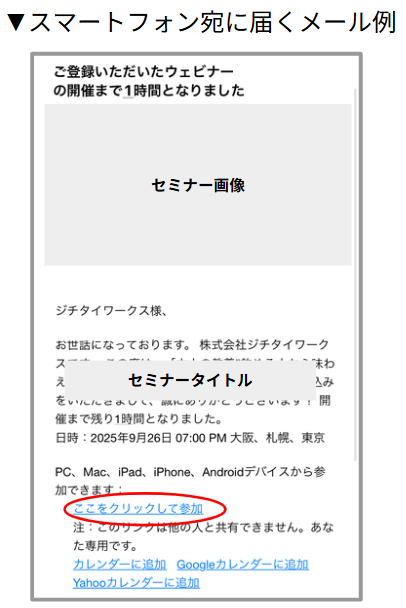 メールは開催1週間前・前日・1時間前に届きますが、どのメールのリンクからでもご参加いただけます。