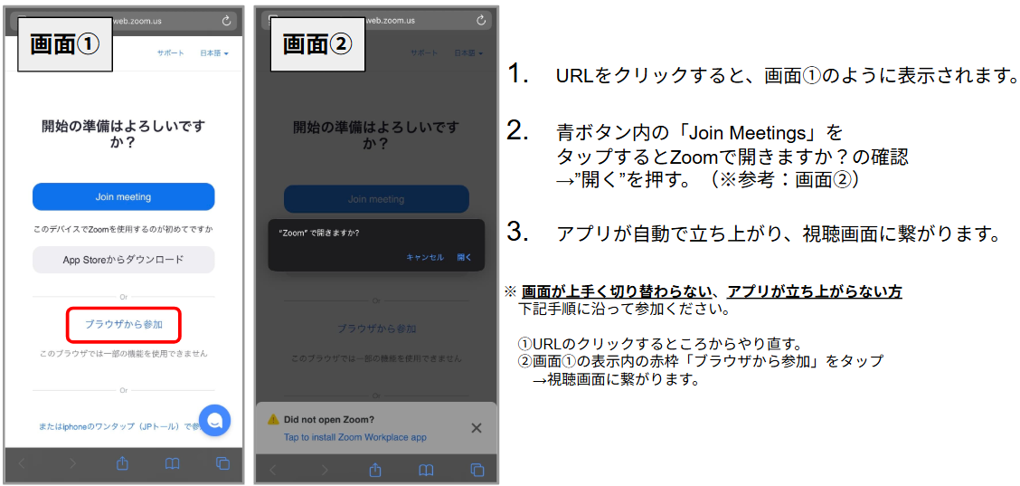 視聴する端末に、Zoomから届く視聴用URLのご案内メールを転送いただくか、視聴端末でウェビナーIDを入力いただきますと、そちらで視聴いただけます。
