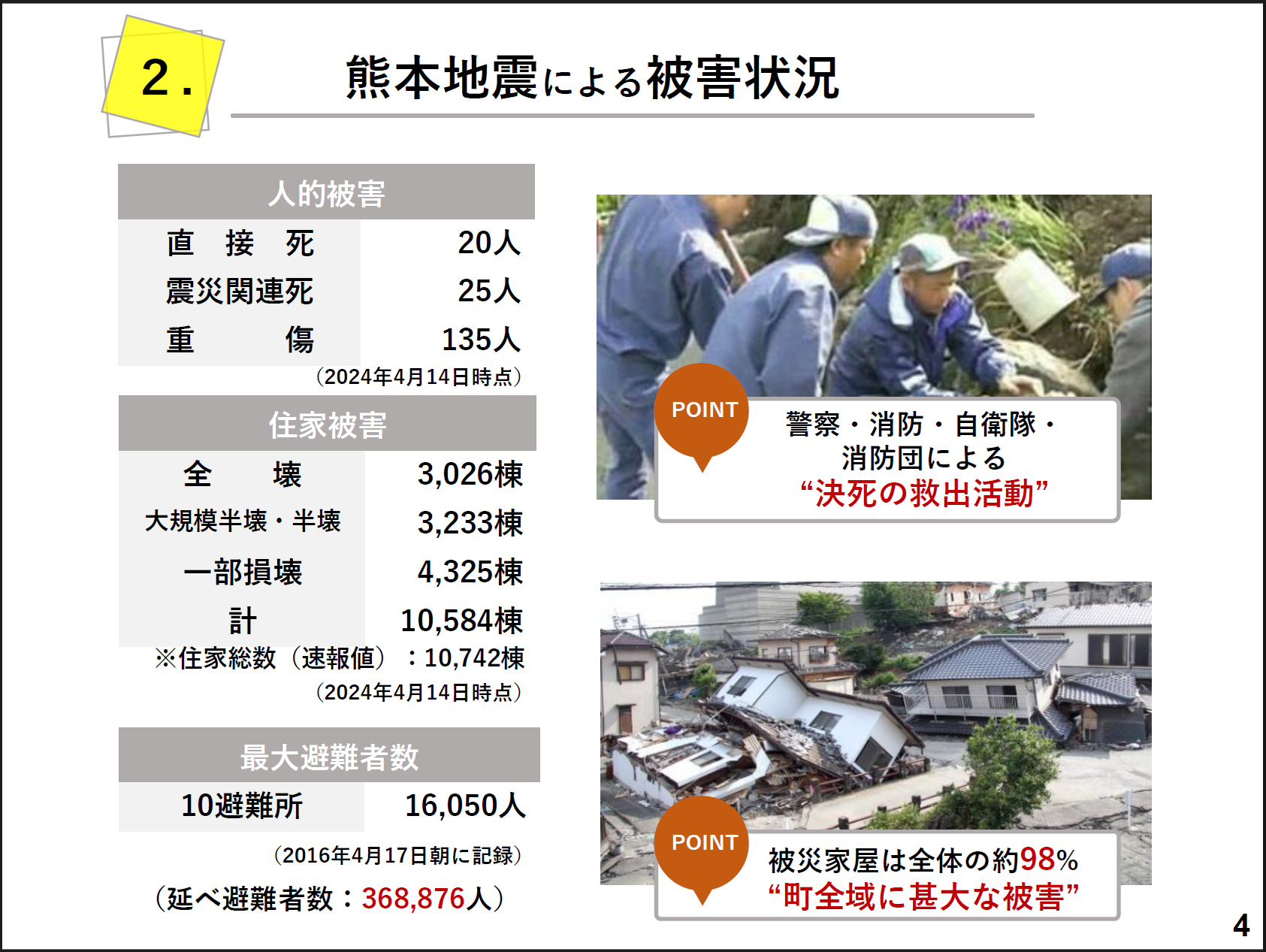 直接死は20人、震災関連死は25人、重傷は135人という人的被害を受け、被災家屋は全体の約98%と町全域が甚大な被害を受けました。