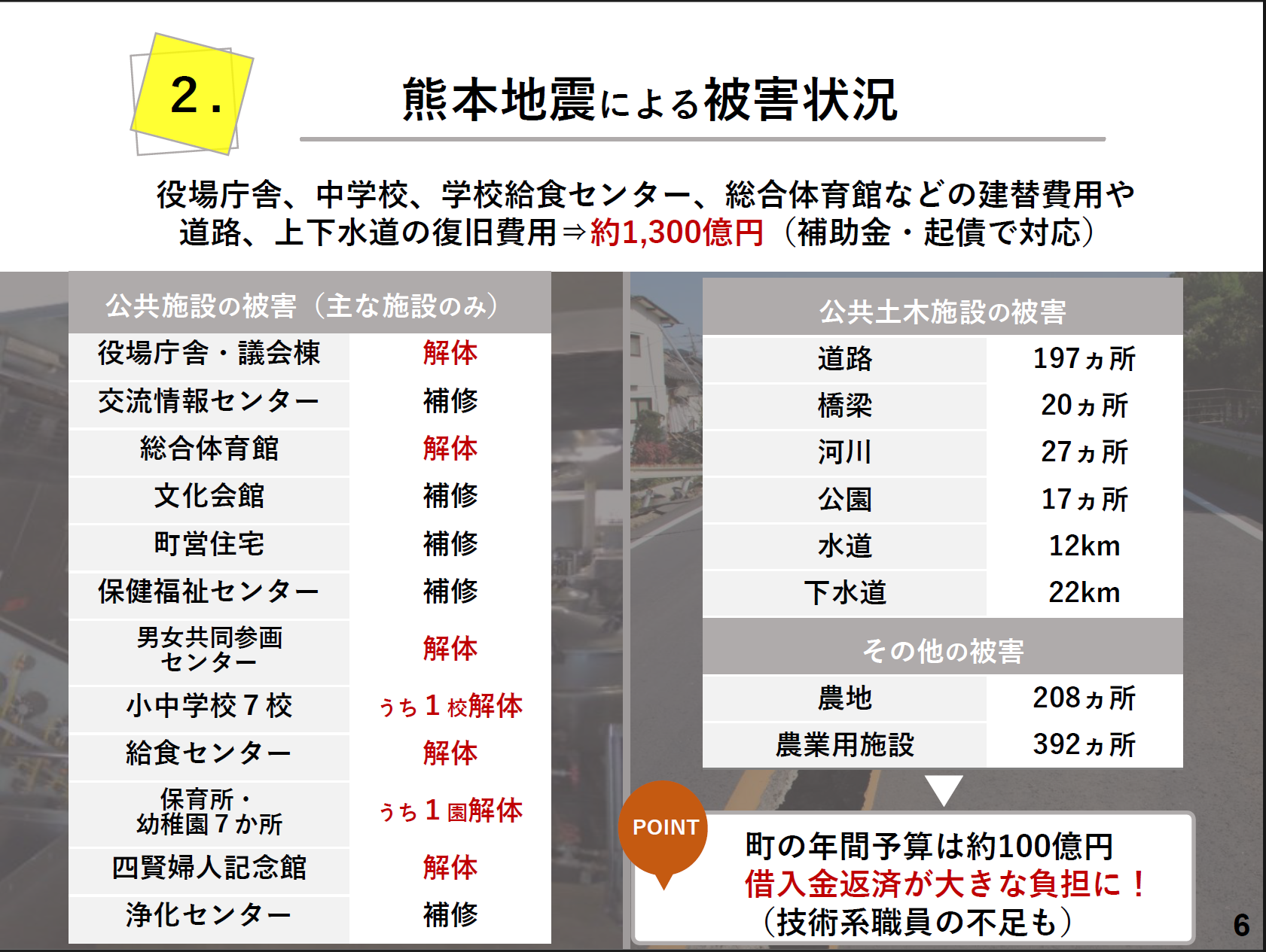 また、役場や道路をはじめとする多くの公共施設が被害を受けたため、建て替えや復旧が必要となっています。この復旧費用によって借入金が増加し、その返済が町の財政にとって大きな課題です。加えて、深刻な職員不足を補うため、全国の自治体から応援職員の派遣を受け入れるとともに、任期付き職員を採用している状態です。