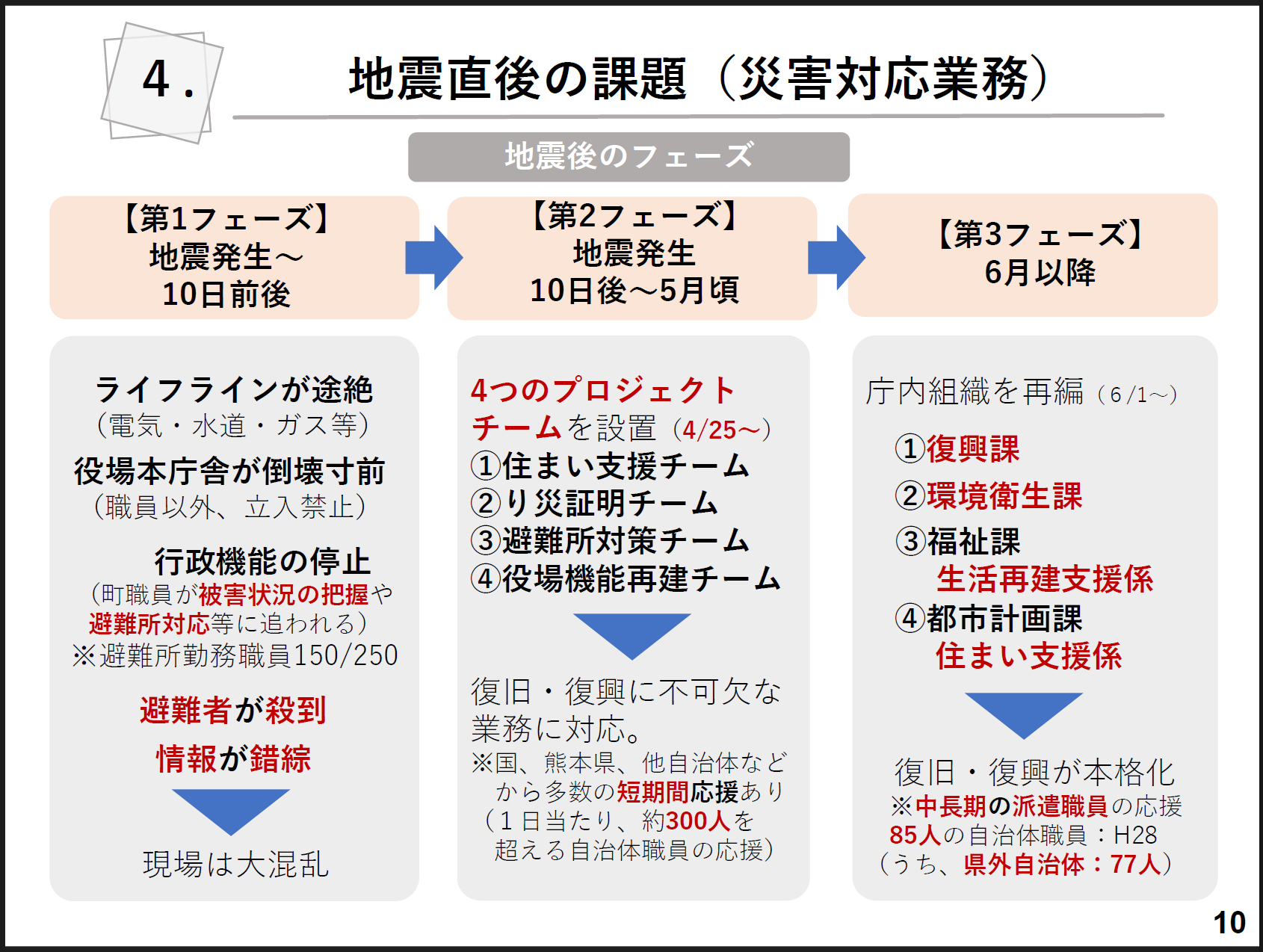 地震後の業務フェーズは大きく3つに分けられます。地震発生直後は場当たり的にしか対応ができていなかったのですが、4月25日以降は「住まい支援チーム」「罹災証明チーム」「避難所対策チーム」「役場機能再建チーム」の4つのプロジェクトチームを立ち上げ、復旧・復興に不可欠な業務に対応しました。また、6月以降は庁内組織を再編し、さらに復旧・復興が本格化していきました。