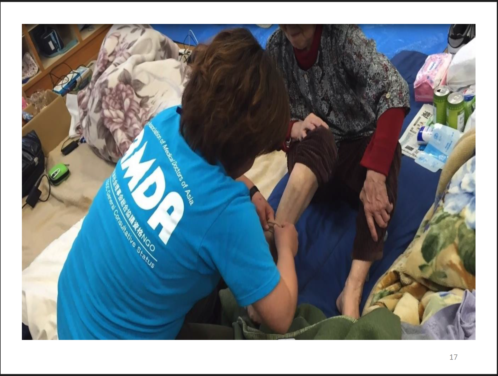 奥村:当時も、エコノミークラス症候群などが心配だという声があがりました。対策として、弾性ストッキングを配布したりラジオ体操をやったりと、工夫は心がけたつもりです。あとは、医療チームの皆さんが巡回してくださったのも非常に助かりました。