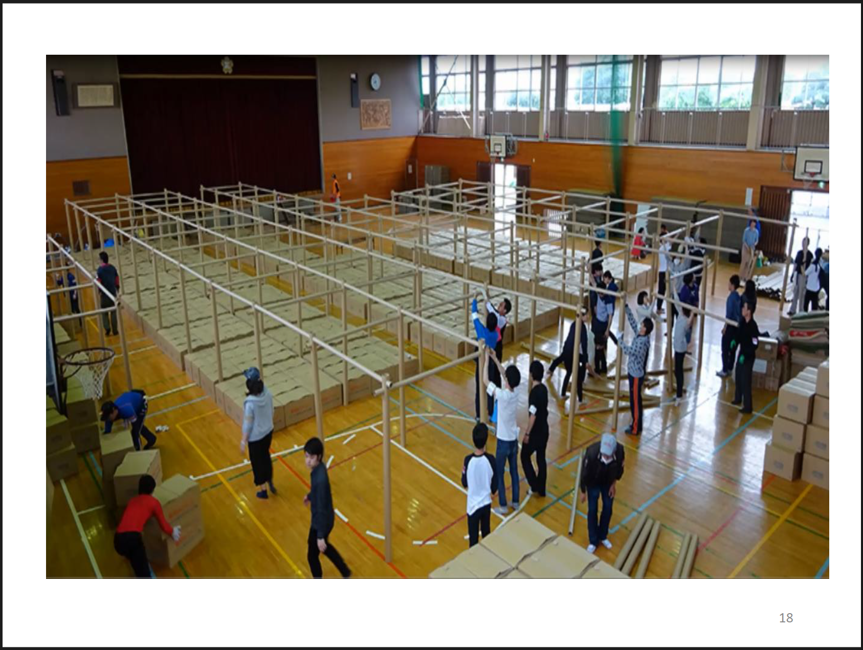 そうしているうちに、5月には学校が再開するということで、体育館を片付け、学生ボランティアの協力も受けながらパーテーションとダンボールベッドを設置。教室に避難していた住民の方々に、体育館に移動していただく手はずを整えました。
