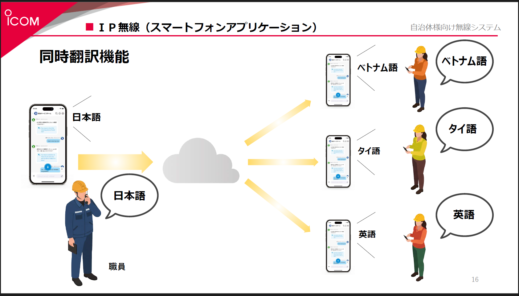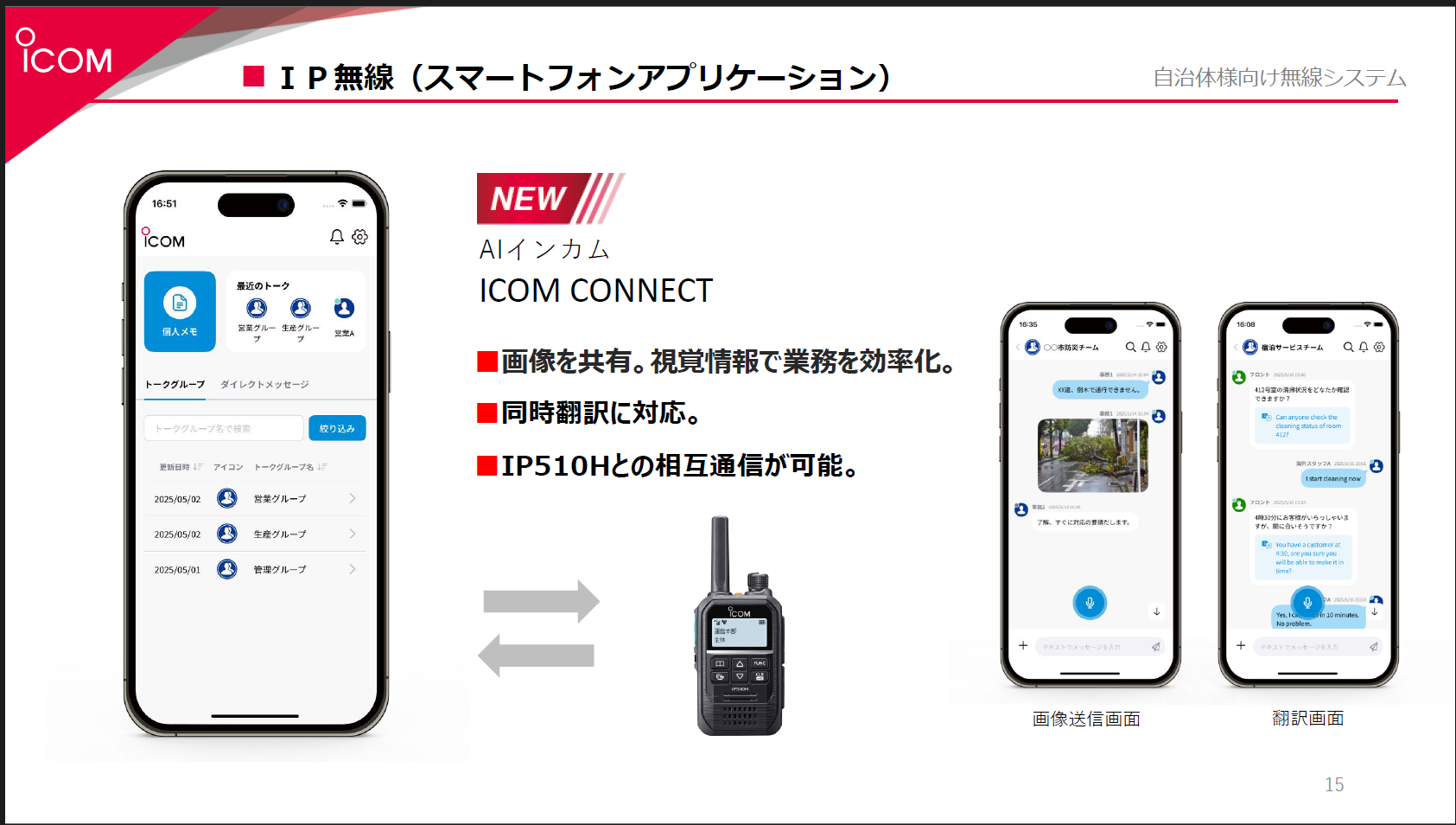 さらに近年は、スマートフォンアプリの活用も注目されています。アイコムが今年7月にリリースした「ICOM CONNECT」は、AI機能を搭載したインカムアプリです。チャット形式での画像送信や音声の文字化、同時翻訳、通話記録などを備えており、災害時の状況把握や外国人対応に大きな力を発揮します。従来のIP無線端末との相互通信も可能で、利用者や運用形態に応じた柔軟な配備ができます。