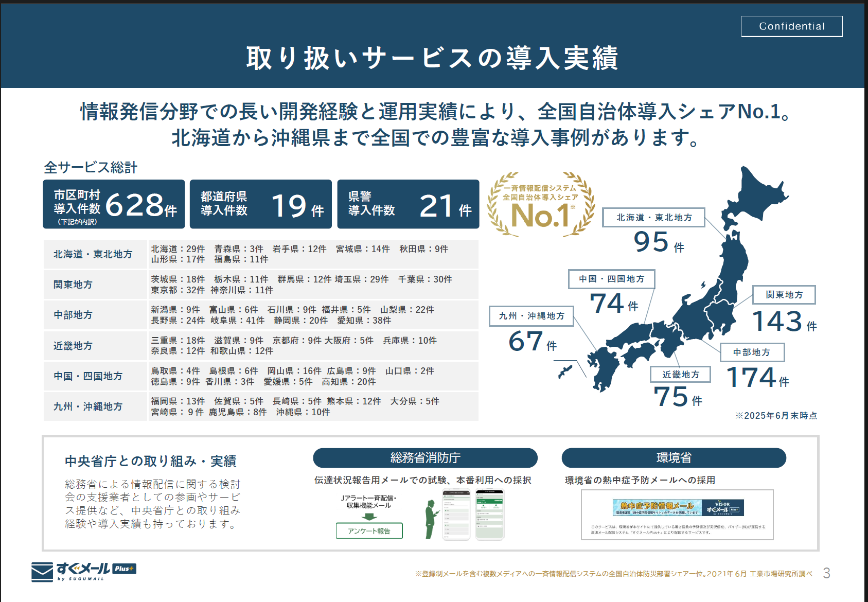 バイザー株式会社は「すぐメールPlus+」「すぐーる」「グッドシティ」「CHIKUWA!」の4つのサービスを中心に、自治体向けの情報発信ソリューションを提供しています。ありがたいことに、市区町村の導入件数は628件(全サービスの総計)となっています。