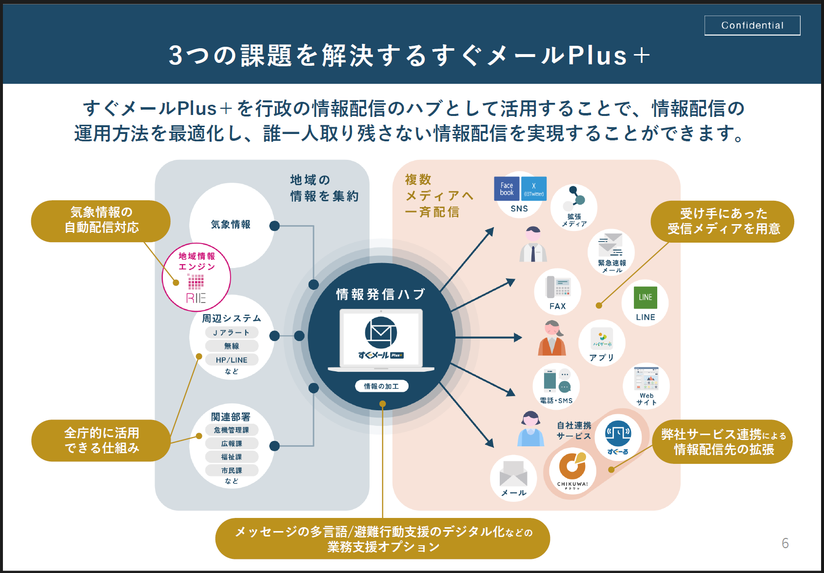 「すぐメールPlus+」は、災害対応における課題を解決するための「情報通信ハブ」として設計されています。大きな特徴は、多様なメディアに対して任意の組み合わせで一斉配信が可能な点です。情報の入力は手動でも行えますが、防災行政無線やJアラート、気象庁からの情報といった外部データと自動連携することもできます。これにより、災害発生時の初動対応をシステム内でスムーズに行うことができ、迅速な情報伝達を実現します。