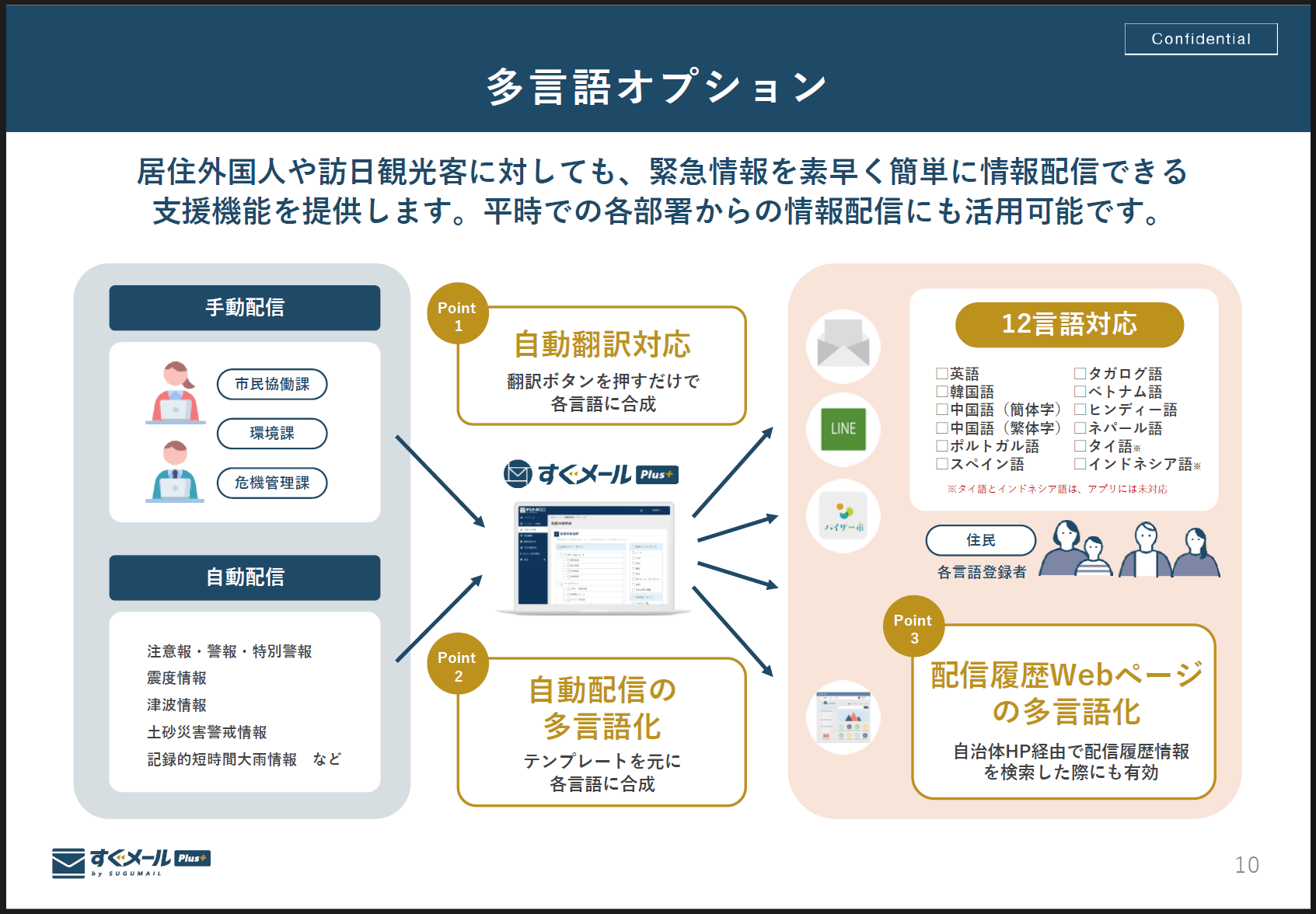 もちろん、配信時には自動翻訳をかけることで、外国人住民にも必要な情報を迅速に届けることが可能です。現在は12言語に対応しています。
