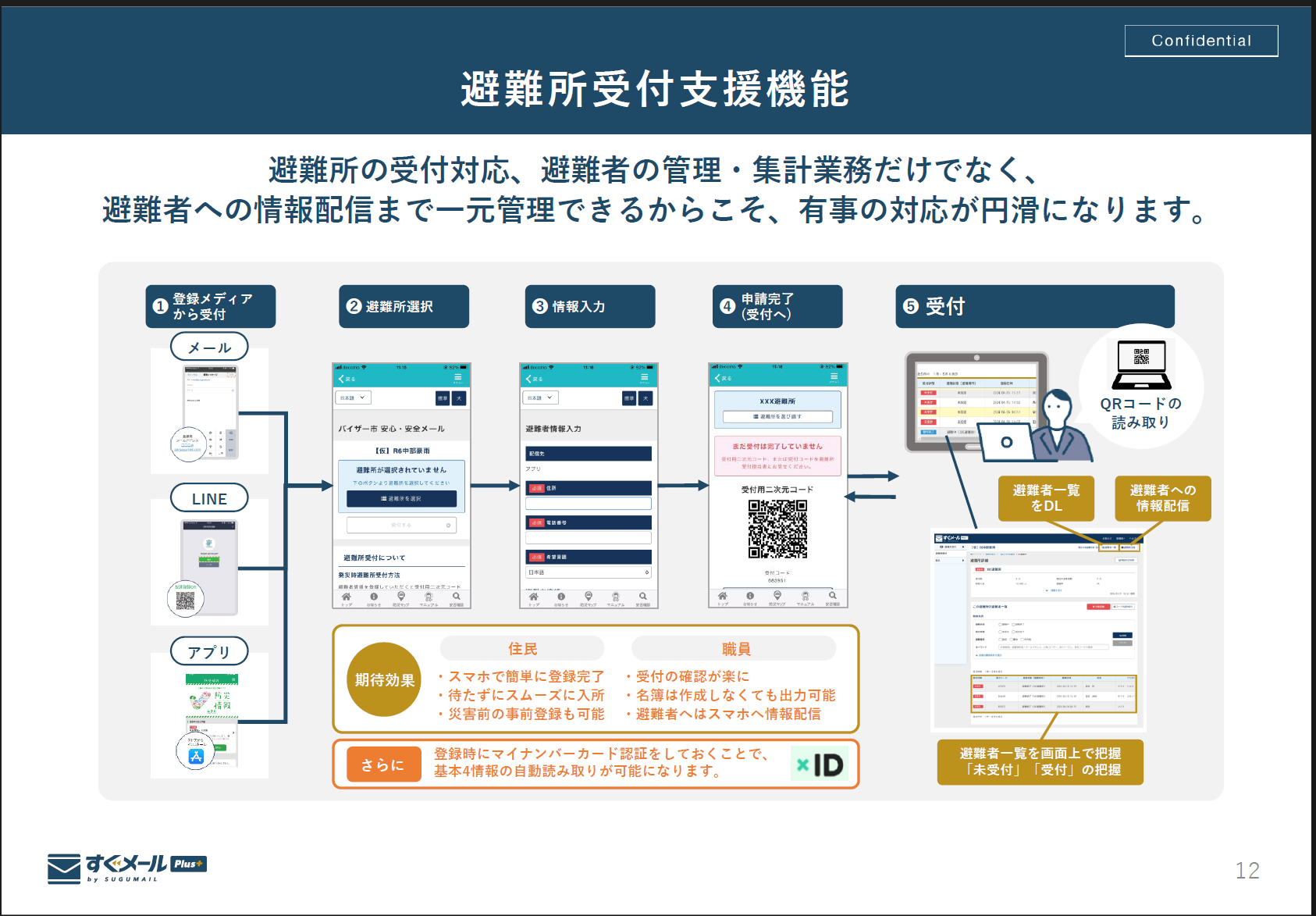 さらに、弊社システムならではの特徴として、平常時から利用している情報受信媒体と受付支援機能を連携させられる点が挙げられます。住民が事前に必要な情報を登録しておくことで、災害時には避難所で二次元コードをかざすだけで受付が完了し、手続きの負担を大きく軽減できます。こうした仕組みが、避難誘導の円滑化と住民の安心感につながっていきます。
