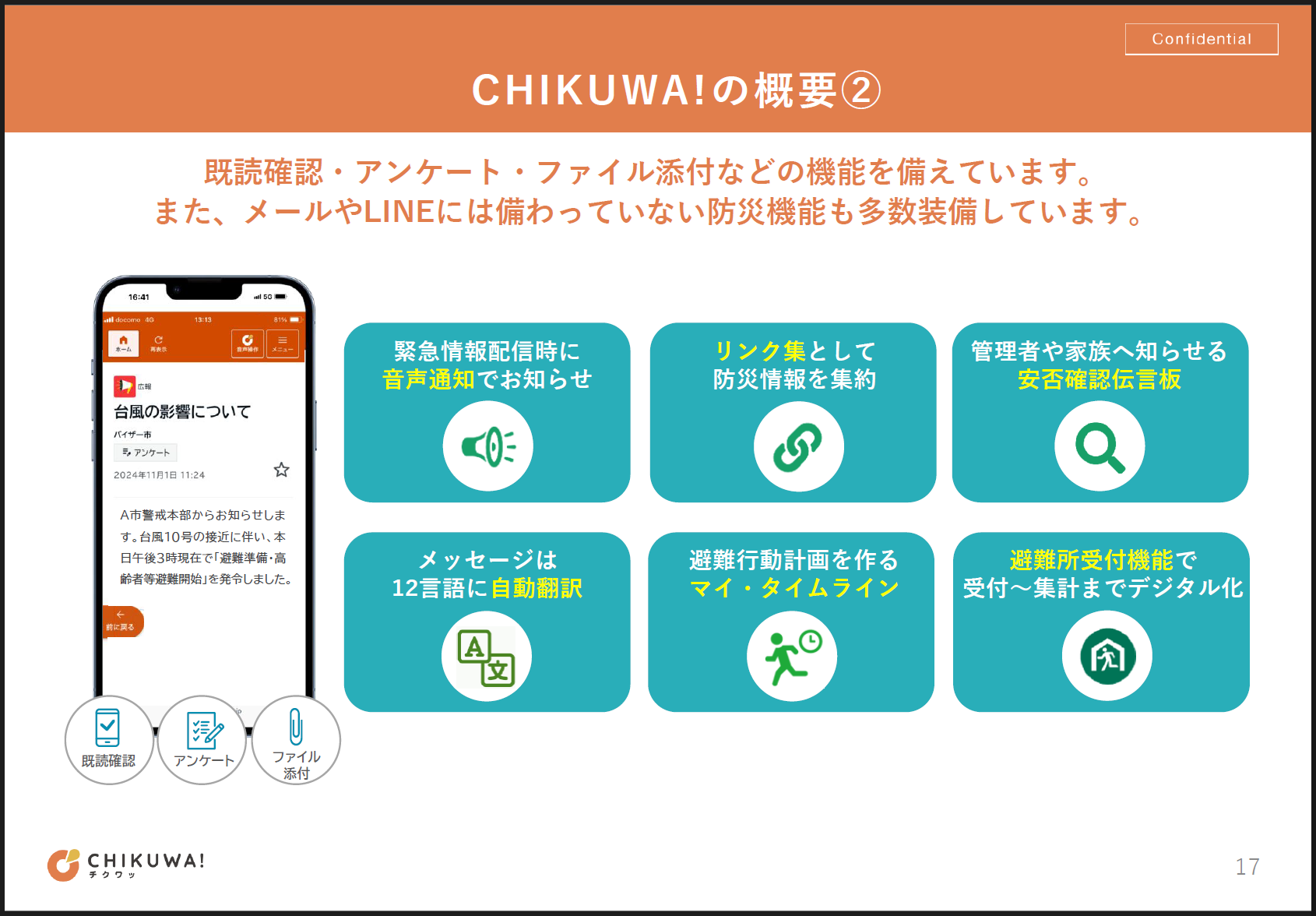 繰り返し強調しているように、防災システムを導入する上で多くの自治体で課題となるのが、住民の登録率がなかなか伸びないことです。そのため、平時から便利に使える機能を備えることで利用者を増やし、普段から情報を受け取る環境を整えておくことが欠かせません。加えて、従来のように一方通行で情報を発信するのではなく、双方向でのやりとりも重要です。こうした課題は「CHIKUWA!」など弊社のサービスを使うことで課題解決につながると考えています。