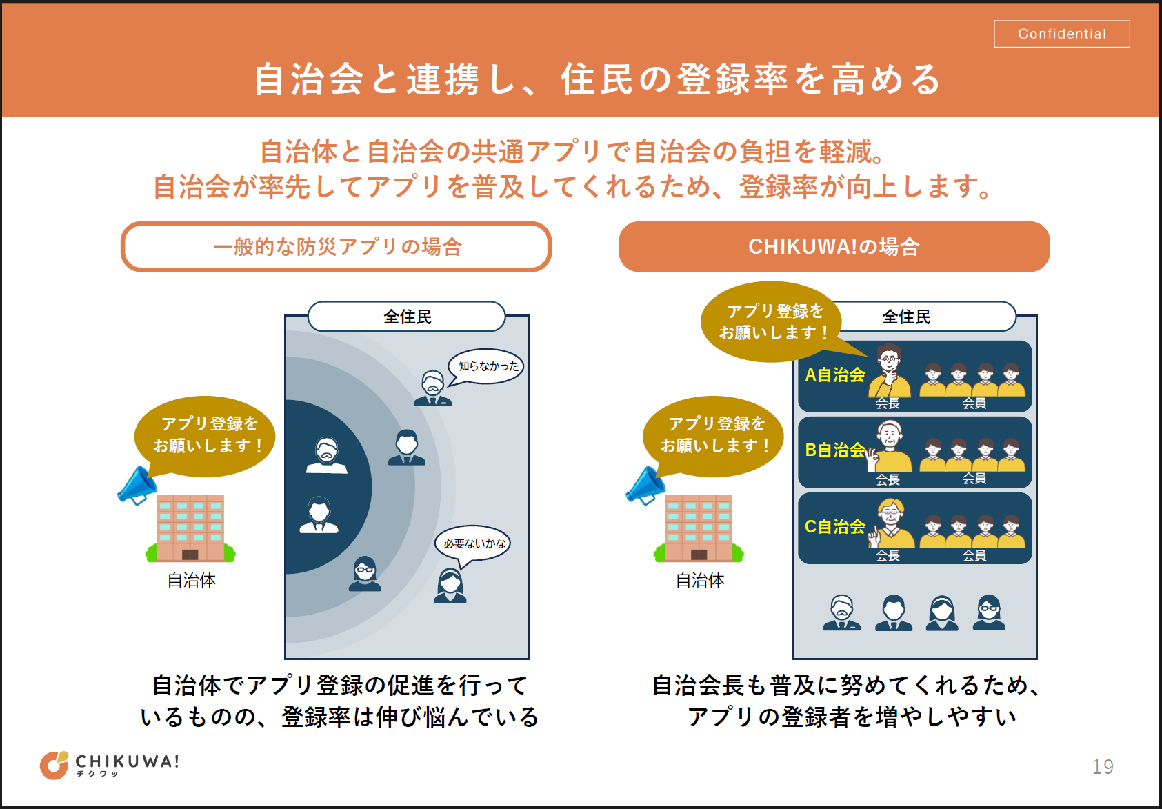 また、「CHIKUWA!」には独自の特長があります。自治体が自らアプリ登録を促すだけでなく、地域の会長や関係者を通じて住民に利用を広めてもらう体制を整えられるため、登録者を増やしやすいのです。