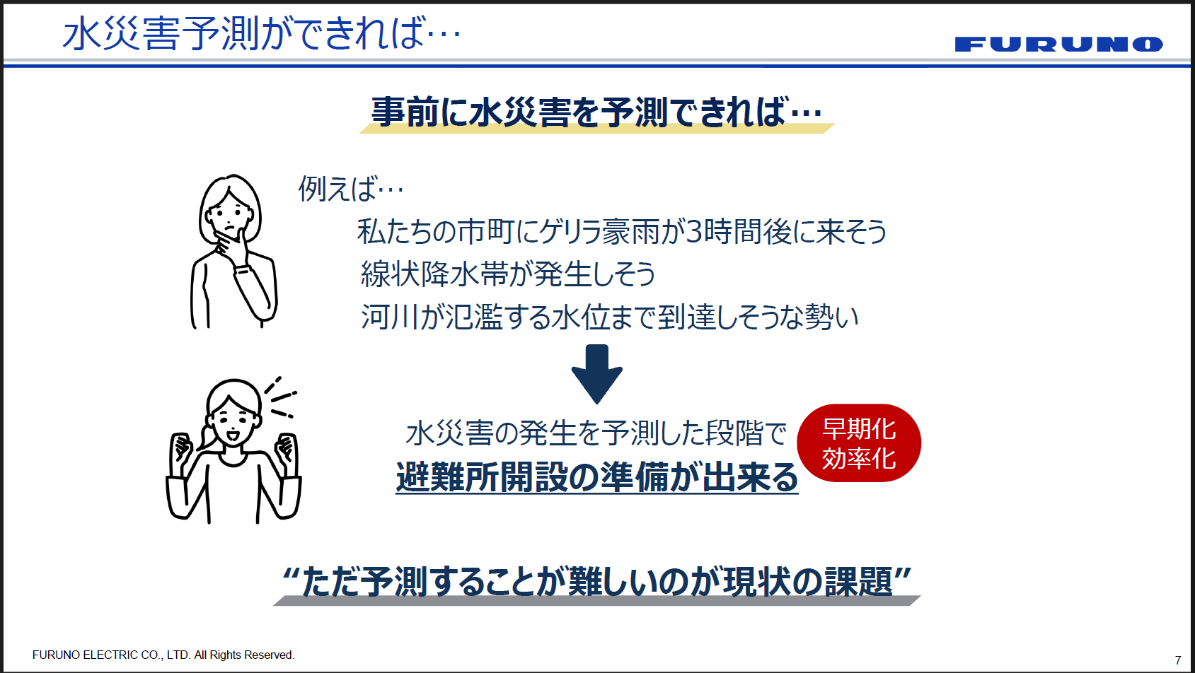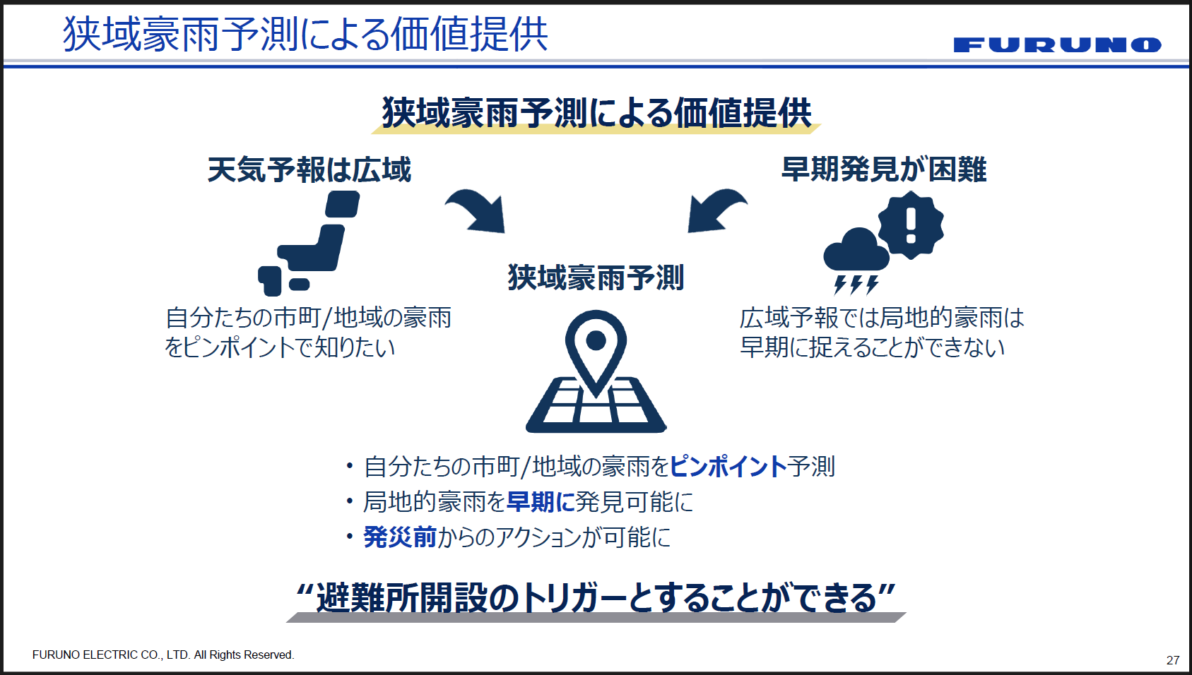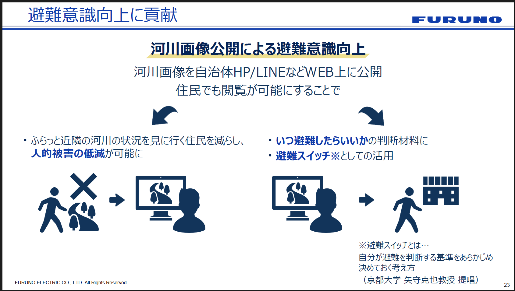 繰り返しになりますが、何より鍵になるのは「発災前から備える」ことです。ピンポイントの豪雨予測によって豪雨前から避難所準備を進め、水位アラートで監視を効率化する。こうした仕組みが、避難判断の迅速化と避難所運営の効率化に直結すると古野電気は考えています。
