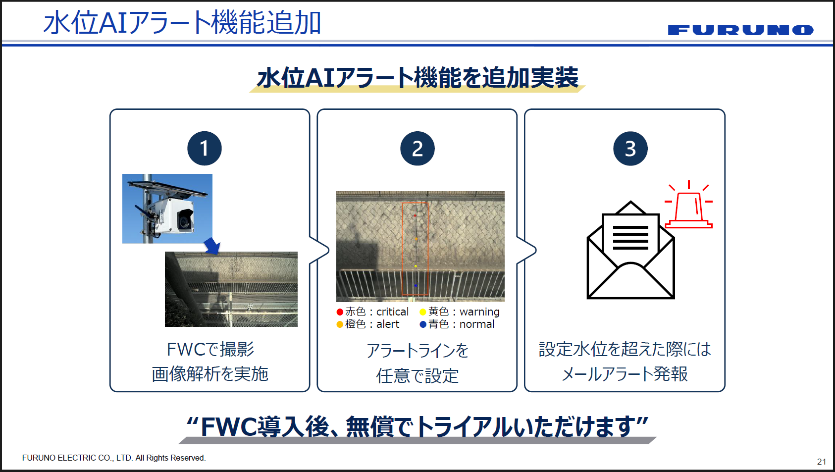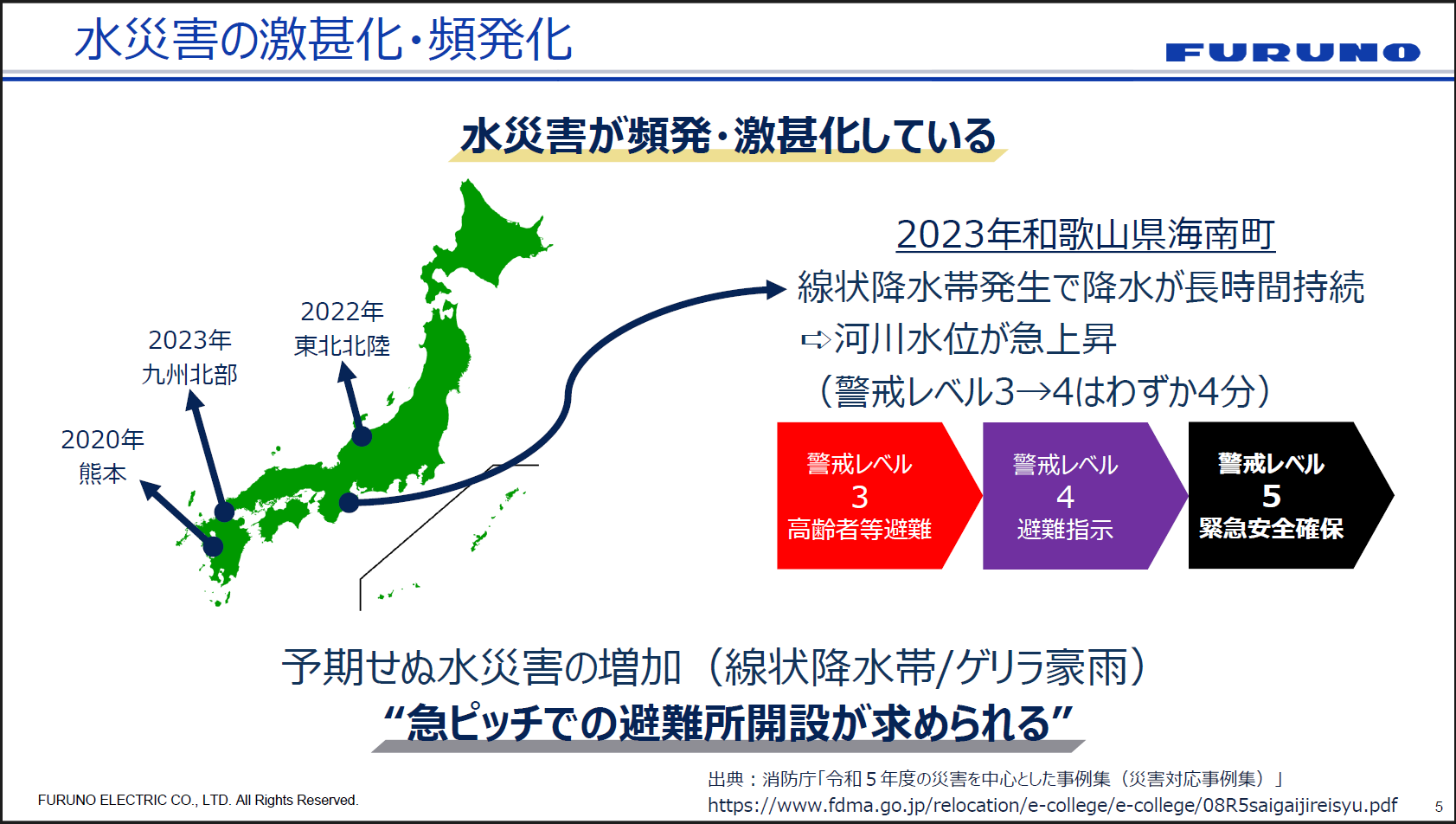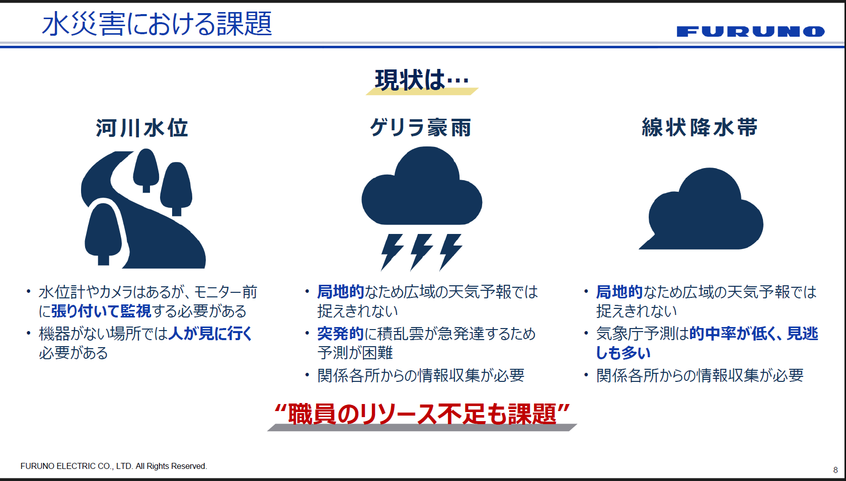 繰り返しになりますが、何より鍵になるのは「発災前から備える」ことです。ピンポイントの豪雨予測によって豪雨前から避難所準備を進め、水位アラートで監視を効率化する。こうした仕組みが、避難判断の迅速化と避難所運営の効率化に直結すると古野電気は考えています。