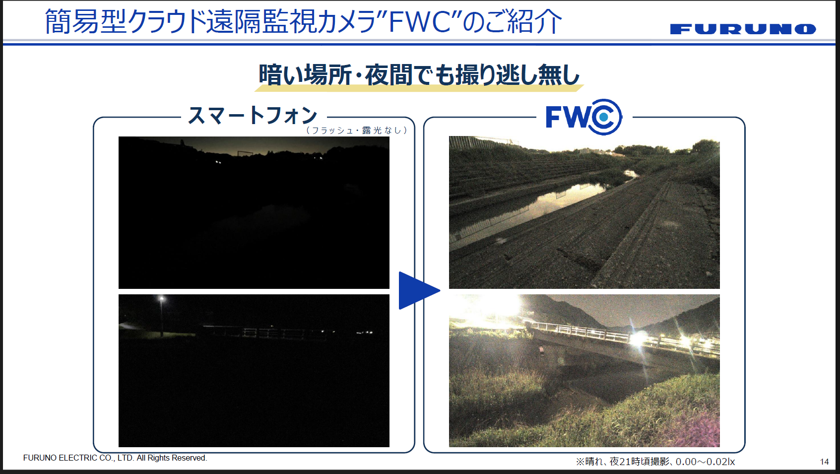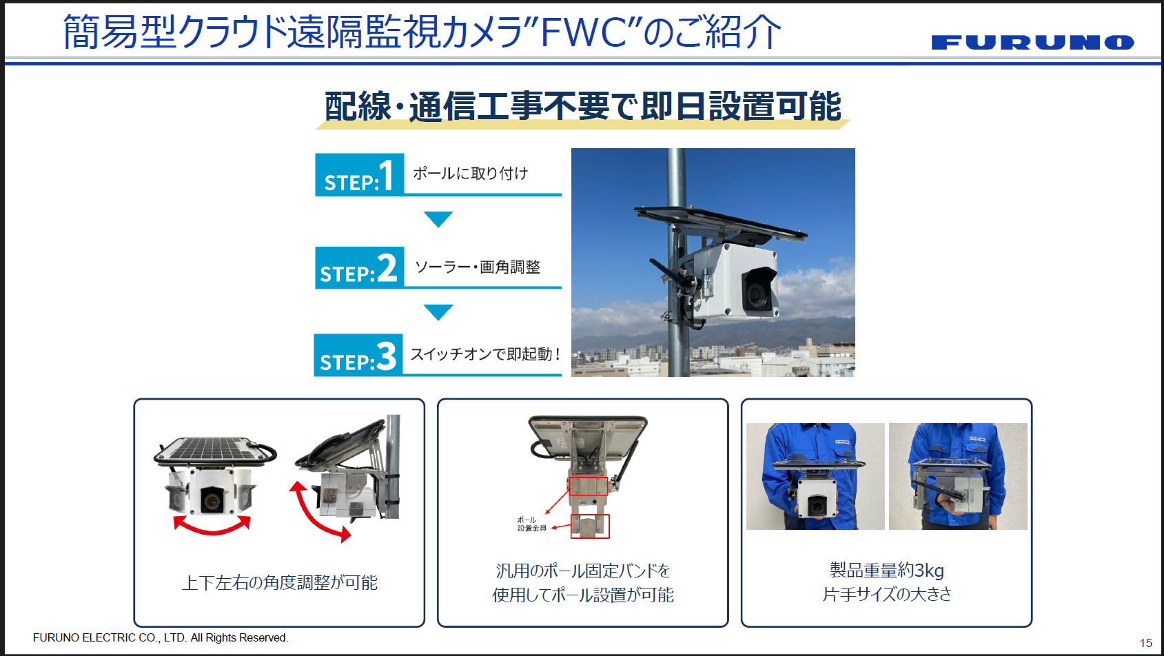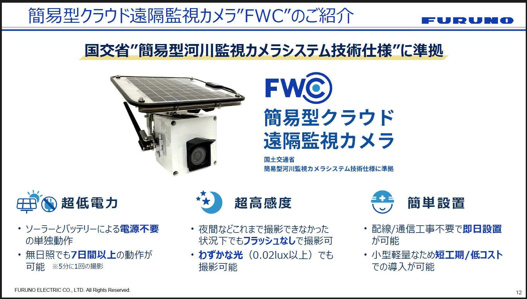 事前に予測・監視・通知の仕組みを整えておくことこそが、限られたリソースの中で住民を守り、災害時の被害を最小化する最も確かな手段であると、私たちは考えています。そこで提案したいソリューションが2つあります。まず1つは「簡易型クラウド遠隔監視カメラ“FWC”」。