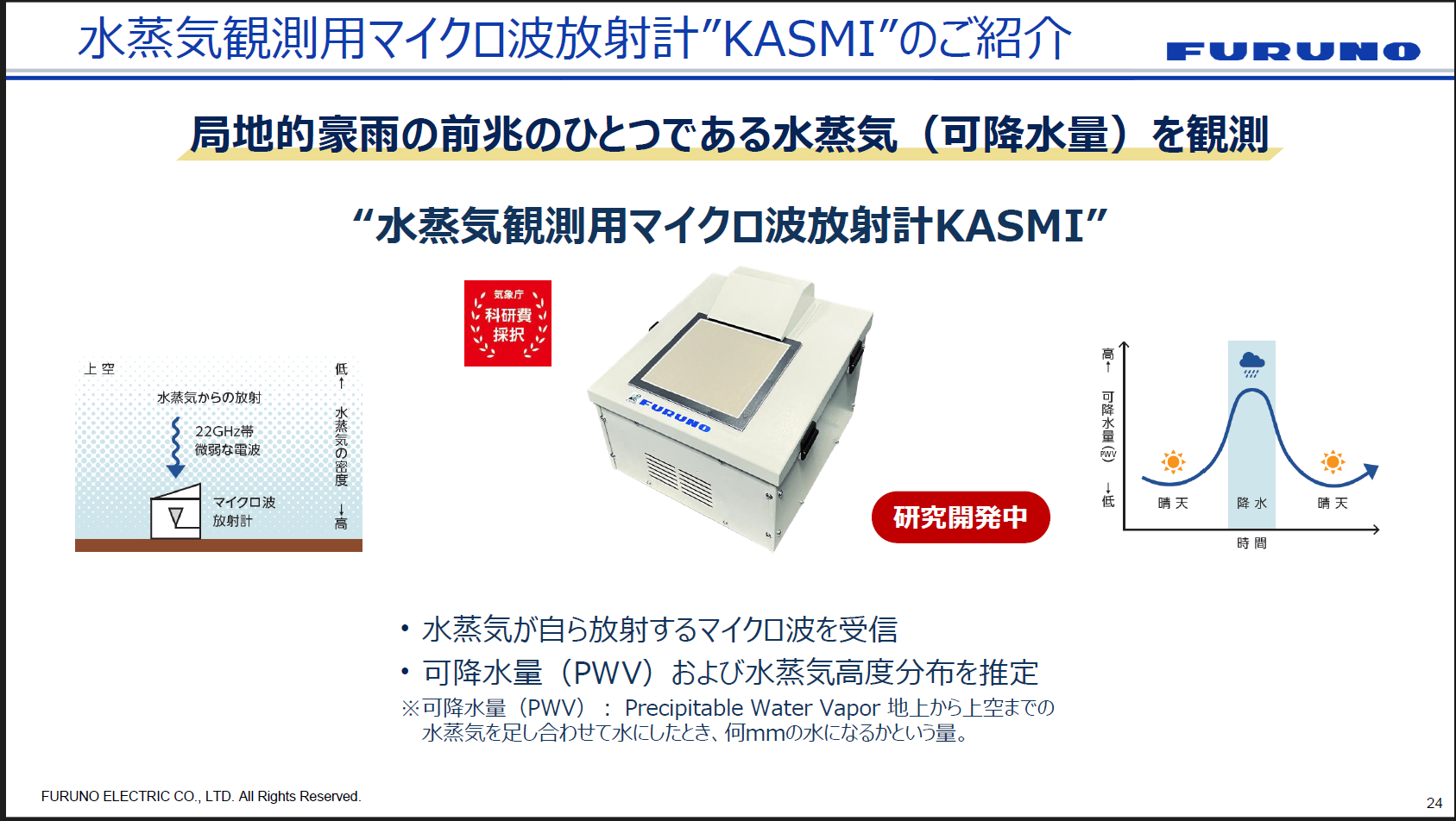 古野電気では、ゲリラ豪雨や線状降水帯への新たな対策として「水蒸気観測用マイクロ波放射計“KASMI”」の研究開発も進めています。