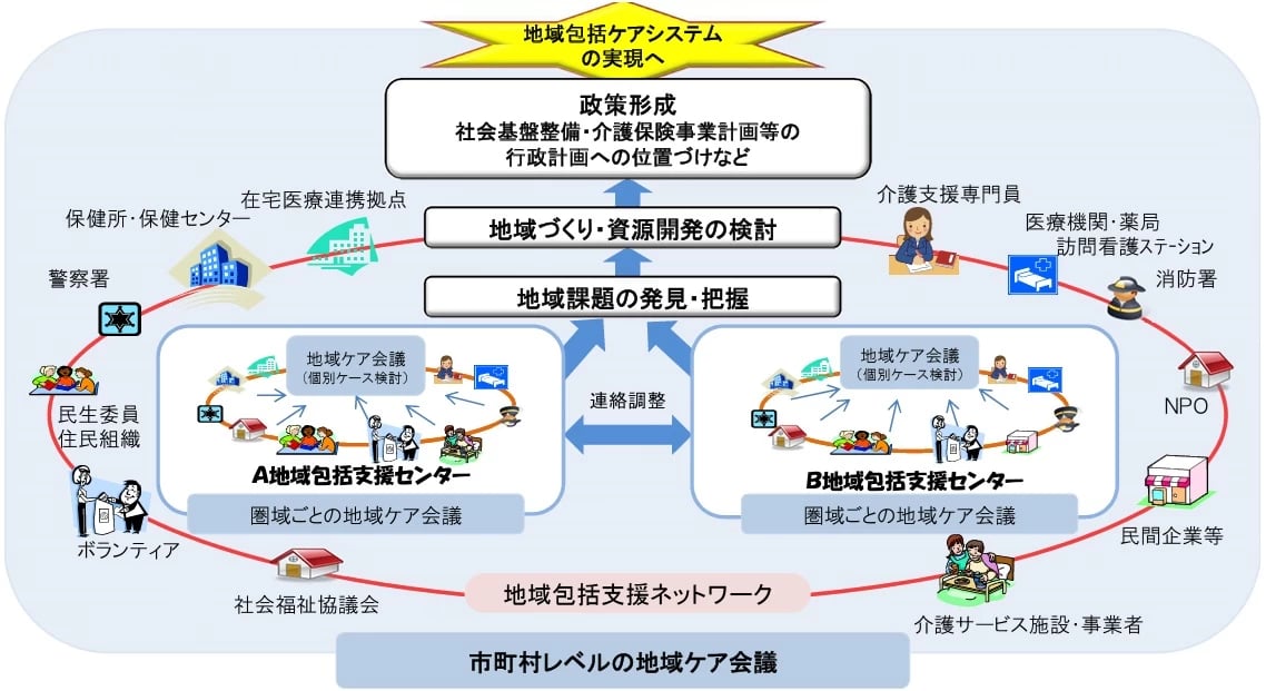 また、個別事例の分析を通じて地域に共通する課題を明らかにし、地域づくりや政策形成につなげることも重要な役割である。すなわち、地域ケア会議は「個別支援」と「地域課題の改善」を両輪として、地域包括ケアシステムを具体的に推進する仕組みといえる。